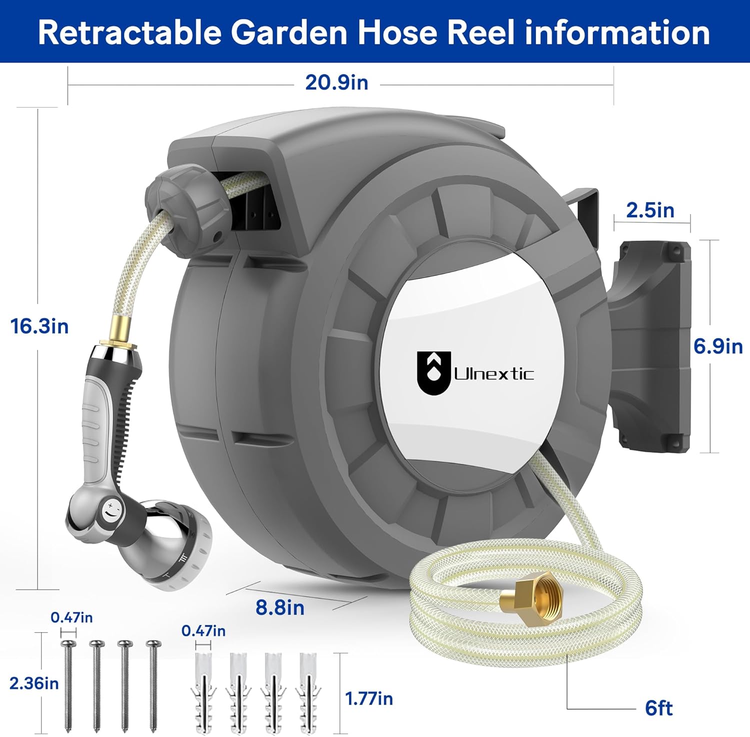 Retractable Garden Hose Reel,1/2 in x 50 ft Wall Mounted Hose Reel,10-Pattern Spray Nozzle, Any Length Lock/Slow Return System/Wall Mounted/180°Swivel Bracket