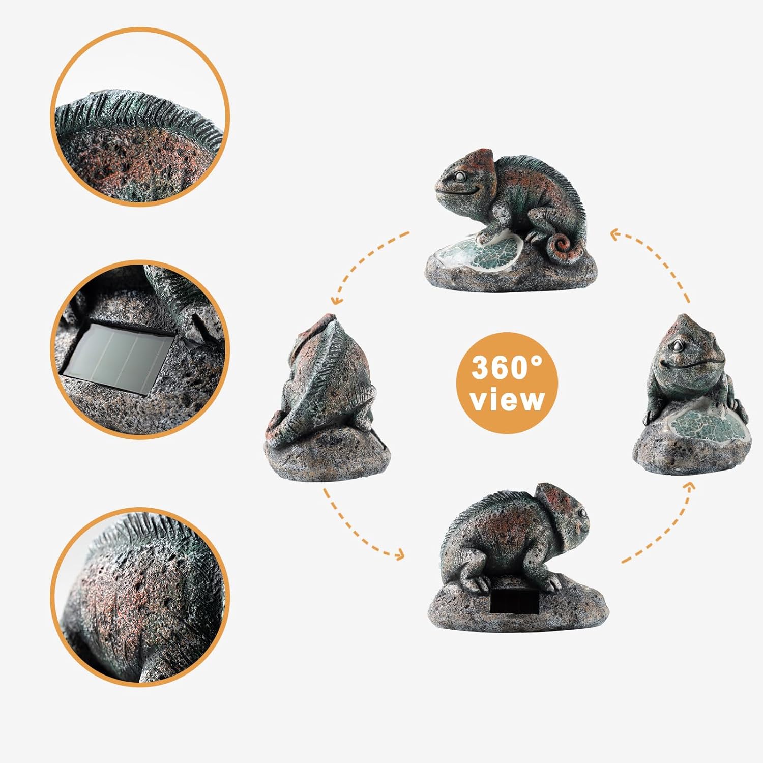 - 【Cute Outdoor Garden Decorations】This solar chameleon garden decor is made of high quality resin.It looks dorable at day and the solar LED lights will Illuminate your front yard,lawn,patio,balcony or garden at night.
