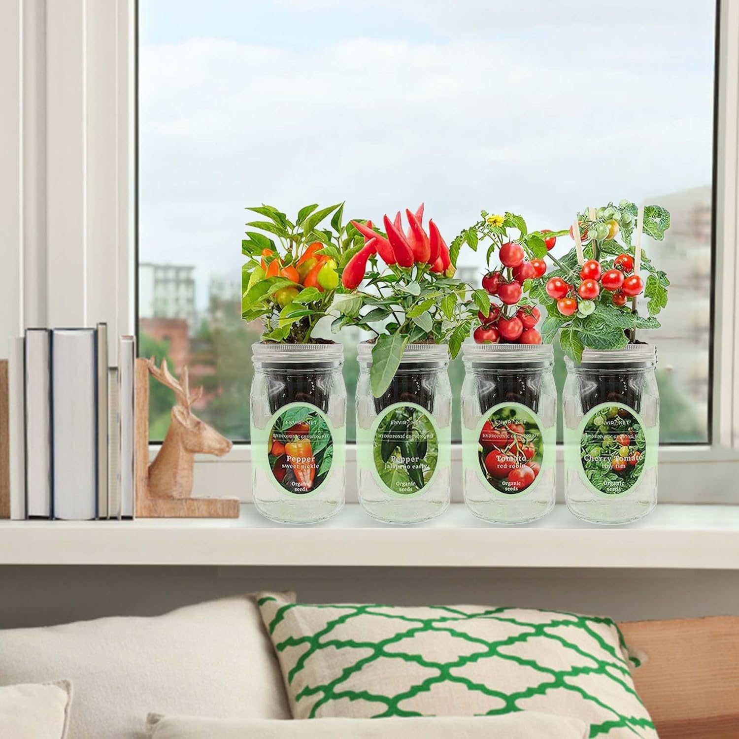 Hydroponic Herb Growing Kit Set, Self-Watering Mason Jar Herb Garden Starter Kit Indoor, Grow 4 Kinds of Herbs from Seeds (2 Tomato & 2 Pepper)
