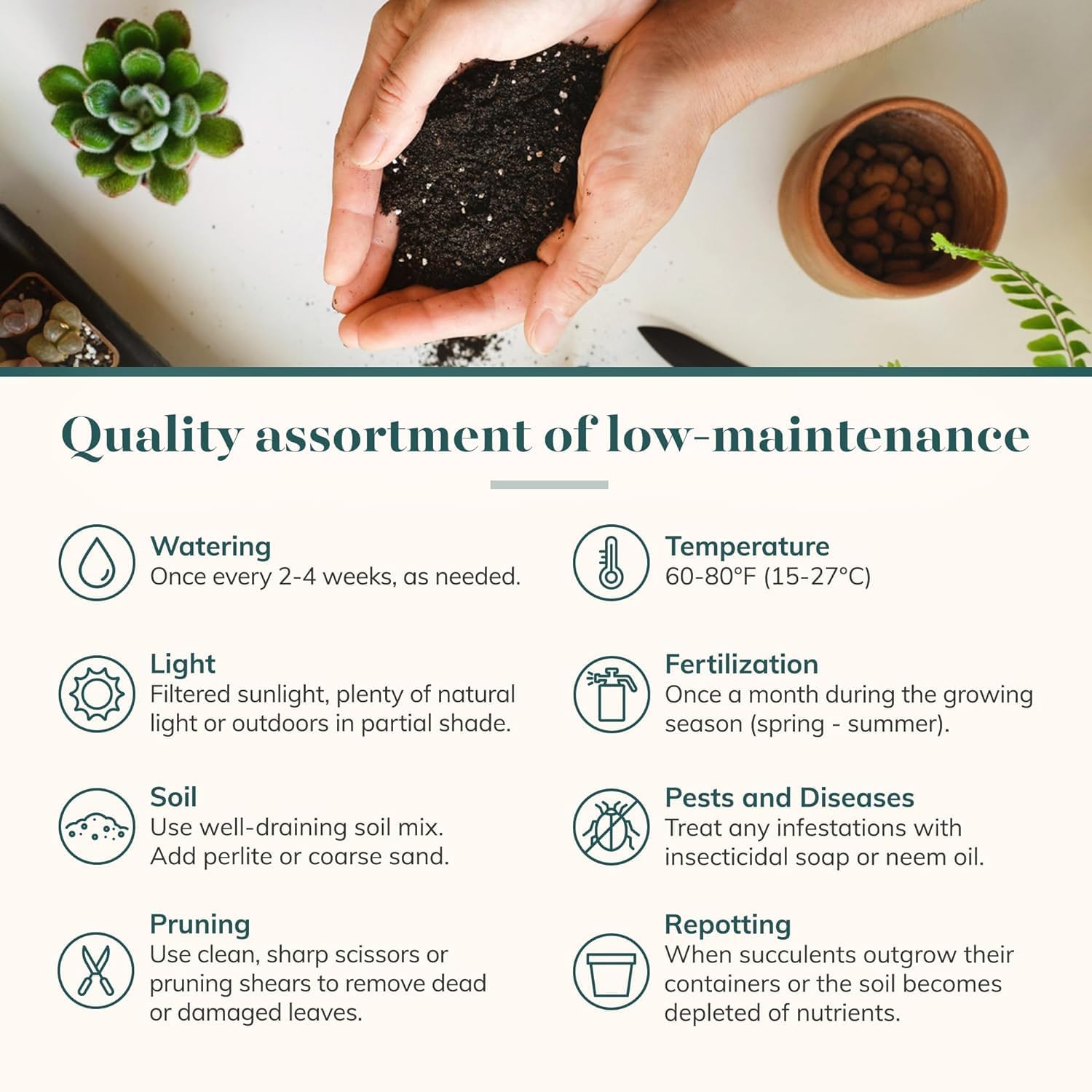 - Availability and Seasonality: Our assortment showcases a wide variety of succulent species, carefully curated for their beauty and hardiness. Keep in mind that availability may vary from photos depending on the season, ensuring you always receive the freshest and most stunning selection.