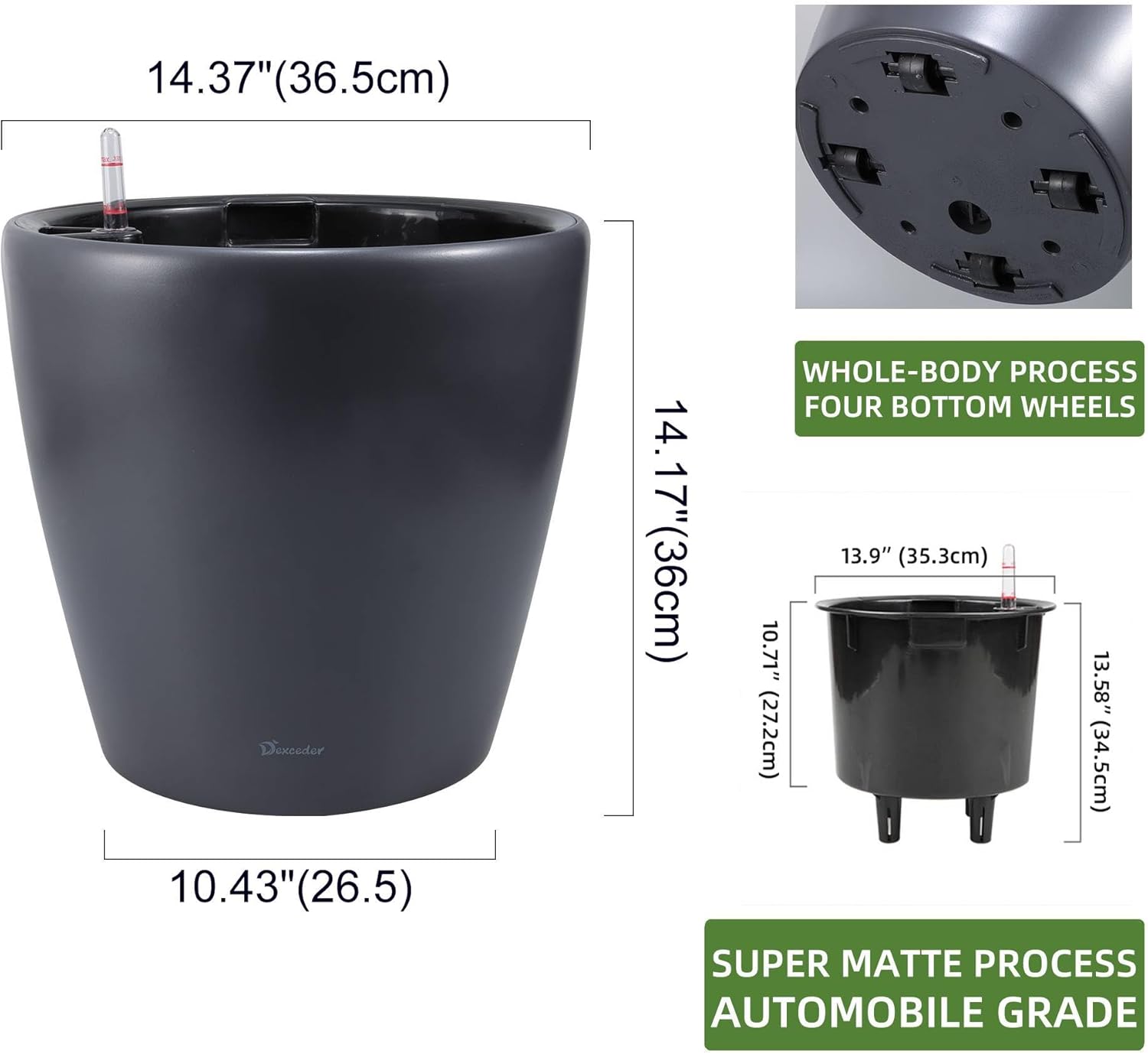 - SELF WATERING & NO MORE ROOT ROT - The smart unique sub-irrigation system is one of the most appealing aspects among all Dexceder planters. The easy-to-use separated integrated water reservoir or catcher- keeps your soil well aerated and automatic supplies plants with the right amount of ongoing moist air & nutrition for optimal growth. The insert indicator shows you the exact time to water again. The full water supply period can single-handedly last over 3 weeks based on different live plants