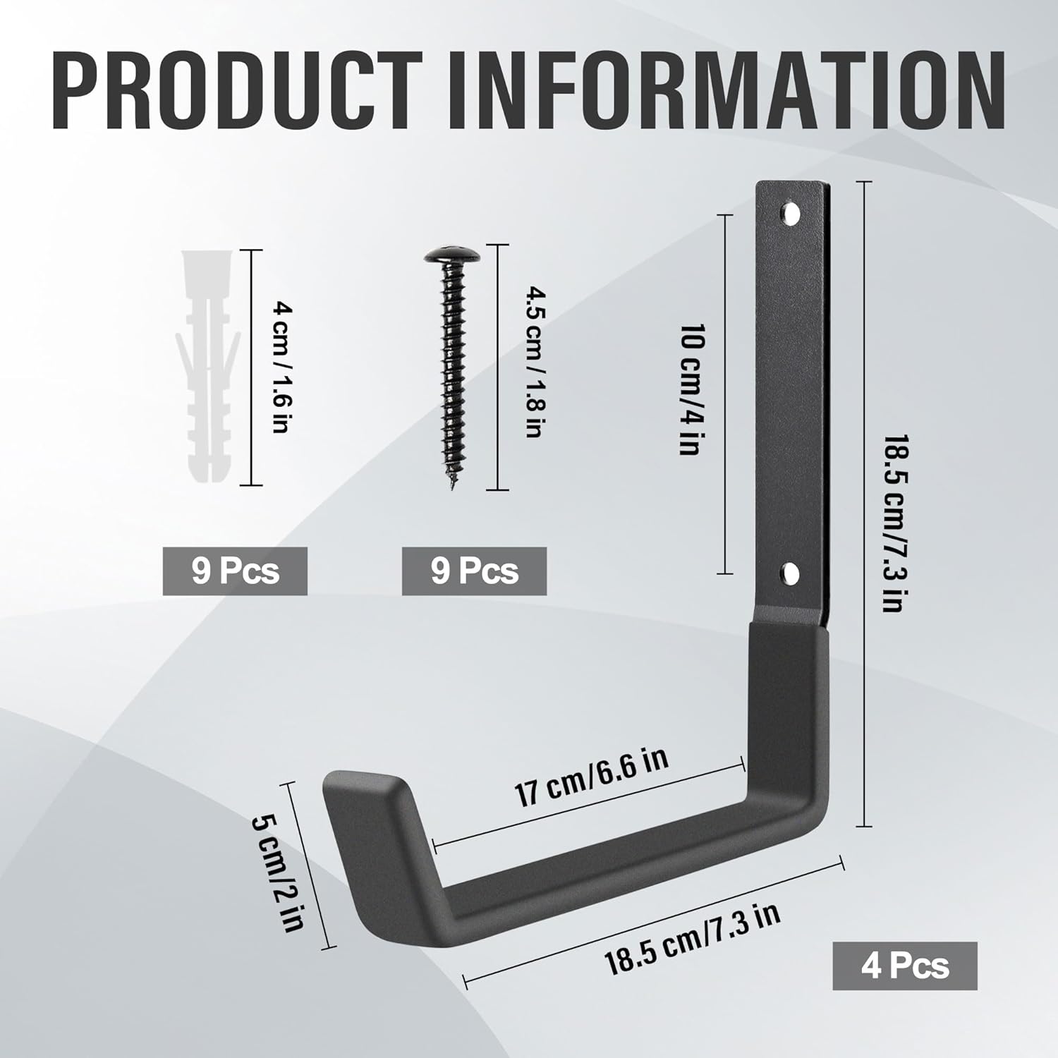 - 【Multi Purpose & Universal】This storage hook is a flexible wall mounting solution for garage, garden, and workshop. It solves most of your needs and keeps you from clutter, and suitable for different walls, such as wood walls, cement walls, brick walls and other walls.