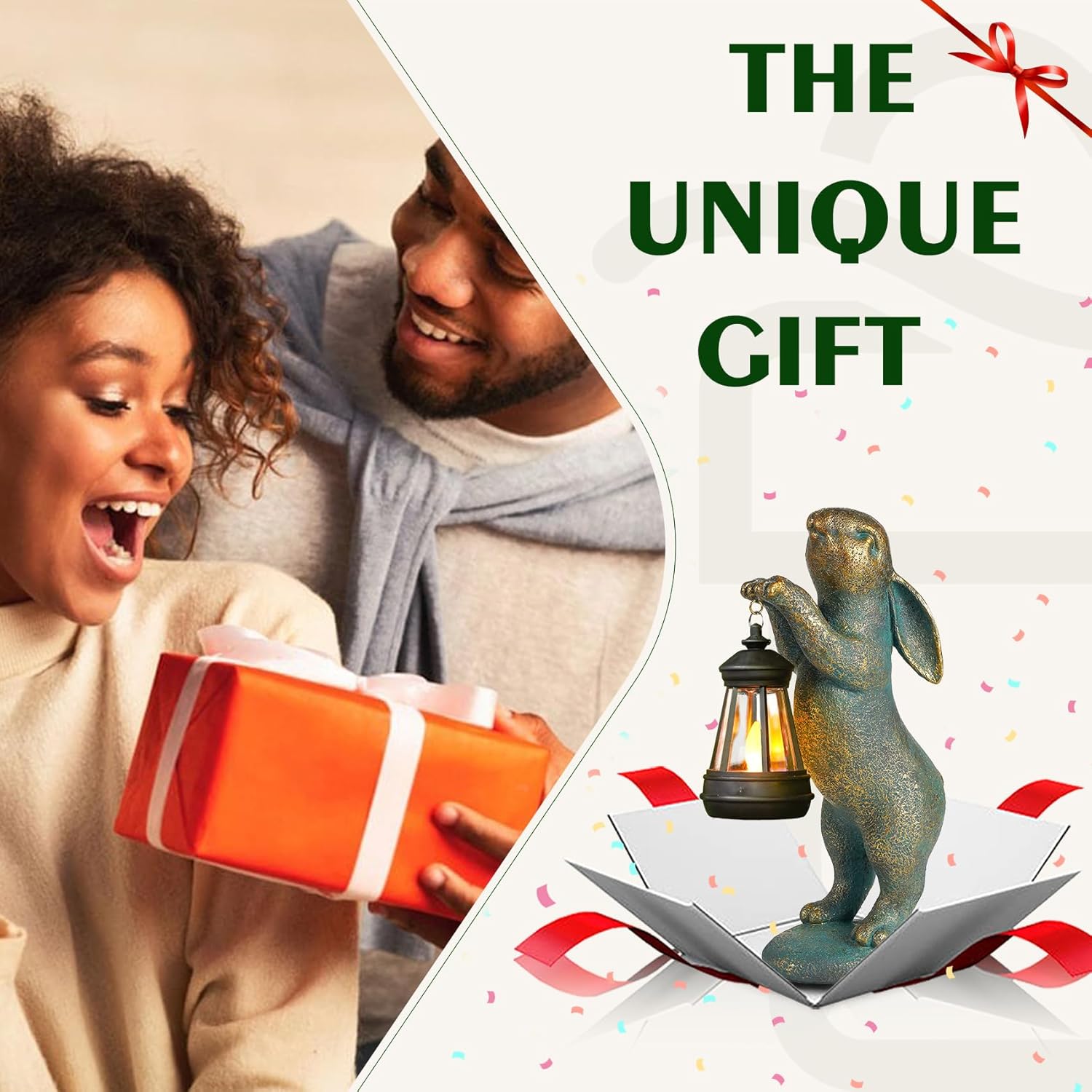 - Solar Rabbit: This bronze rabbit statue holds a solar lantern that emits a warm, welcoming glow. The light mimics a vivid, flickering flame. As a symbol of luck and prosperity, it's perfect for creating a cozy atmosphere in your patio, yard, or porch