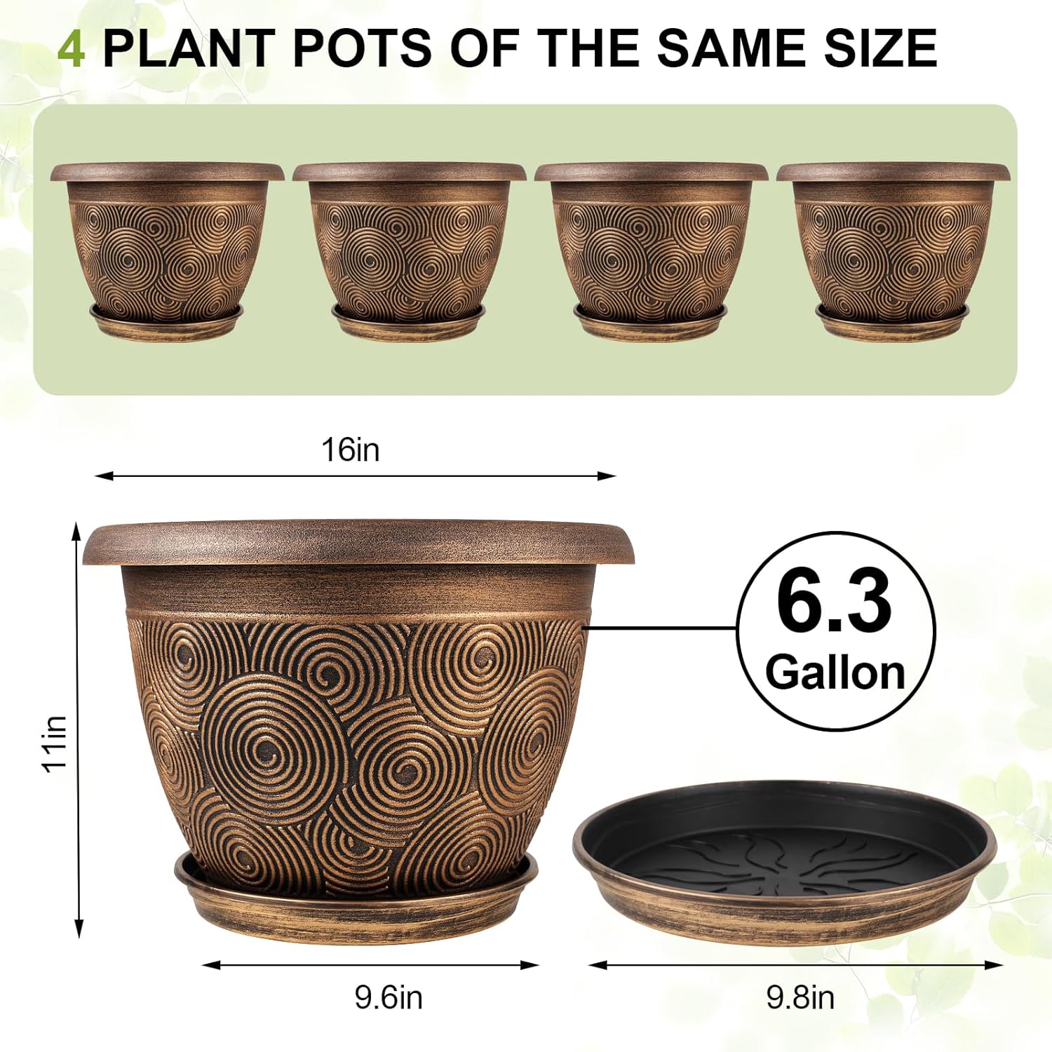 - 【Rolled Rim】Plastic flower pot for indoor plants are designed in rolled rim which helps you to easily move the container, even when it is full of soil. It won't break or crack when lifting. Top diameter: 16 inch, bottom diameter: 9.6 inch, height: 11 inch. Set of 4 pack 16 inch Solid plastic large planter pots are suitable for house plants, succulents, flowers, and cactus.