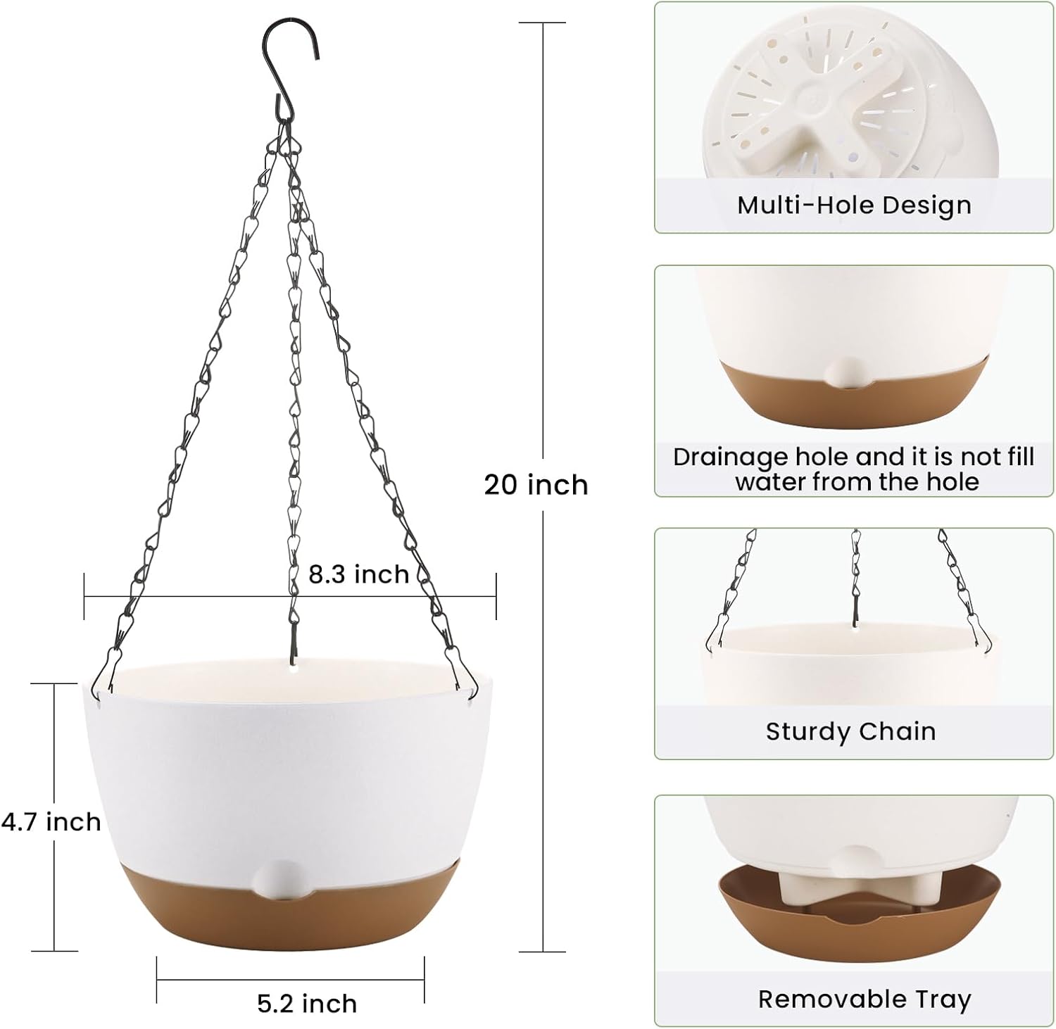 - Automatic Drainage Design: The hanging planter has drainage holes at the bottom, When the water exceeds the edge of the tray, it will overflow from the edge, so that your flower pots will not drown or over water in rainy days.