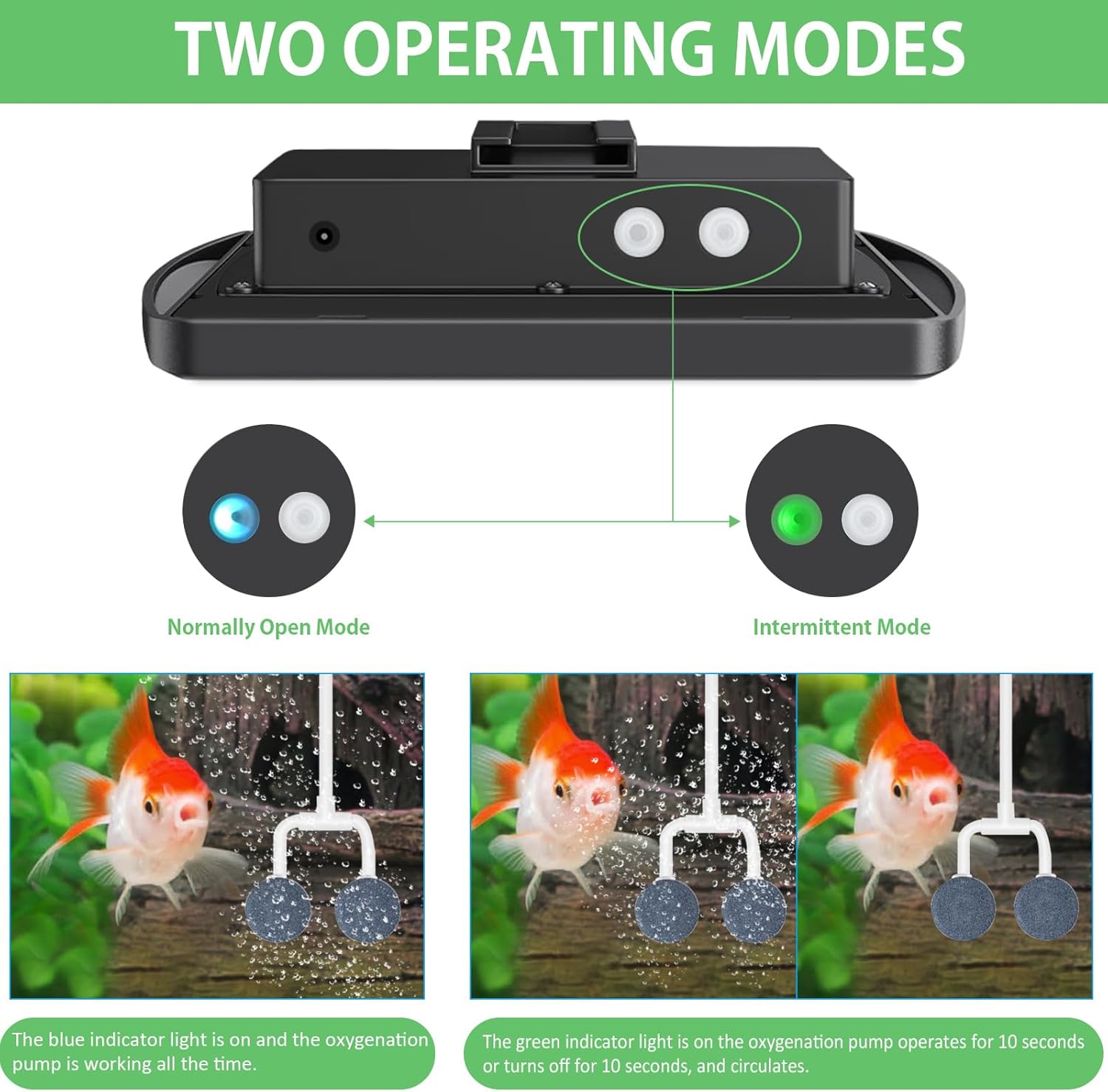 - 【2 WORKING MODES 30H/62H】Outdoor pond solar aerator display blue light means normally open mode(30 hours of operation),display green light means intermittent mode(62 hours of operation). Allowing you to customize the oxygen supply to your fish tank. Equipped with air bubble regulator to ensure even and universal air distribution.