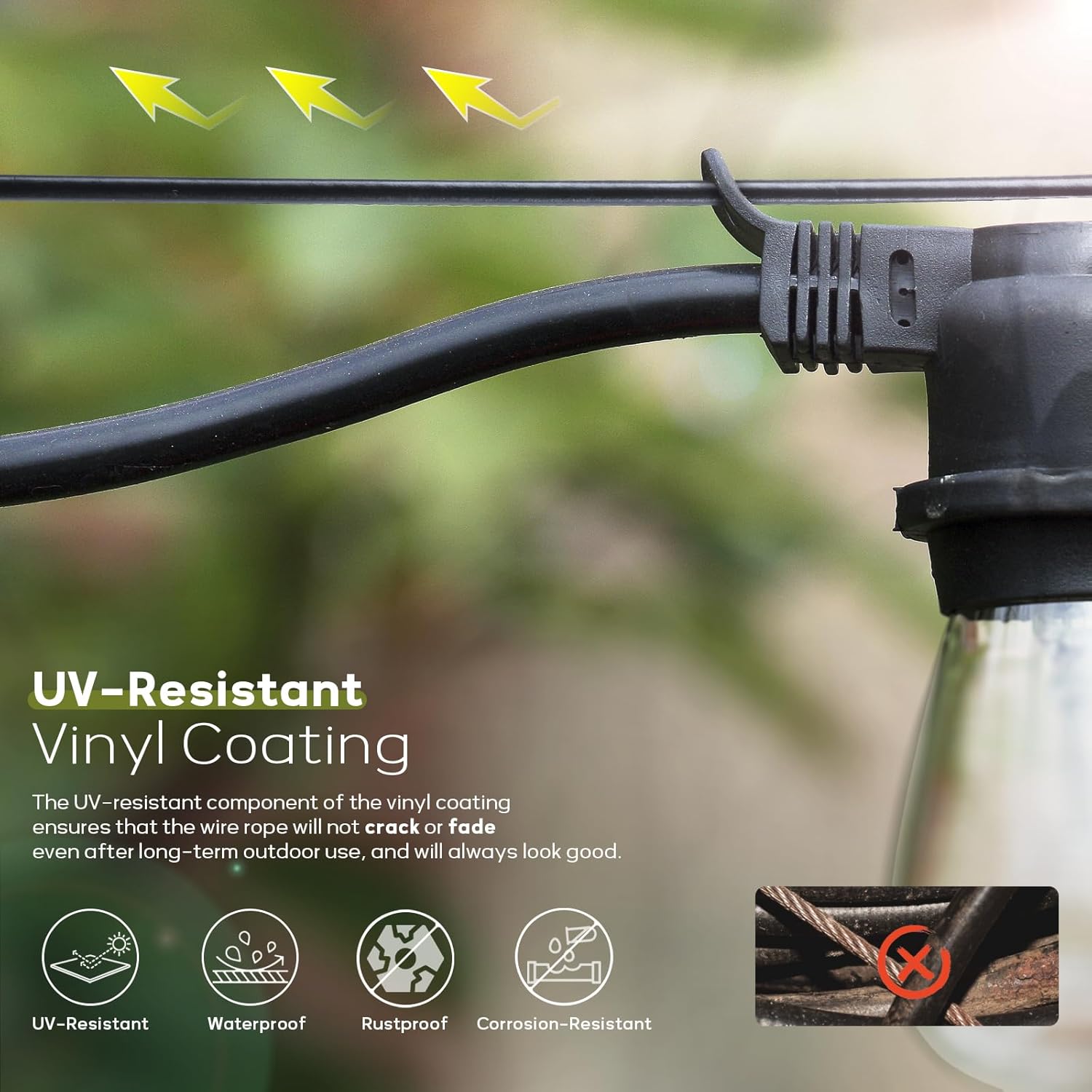 - UV Resistant Steel Wire Rope: The T304 wire rope is coated with vinyl through an injection molding process, making it smooth and gentle on your hands. It boasts excellent waterproof, rust, and corrosion resistance. The added UV-resistant ingredient ensures the cable won't crack or fade, even after prolonged outdoor use, keeping your beautifully decorated garden looking fresh.
