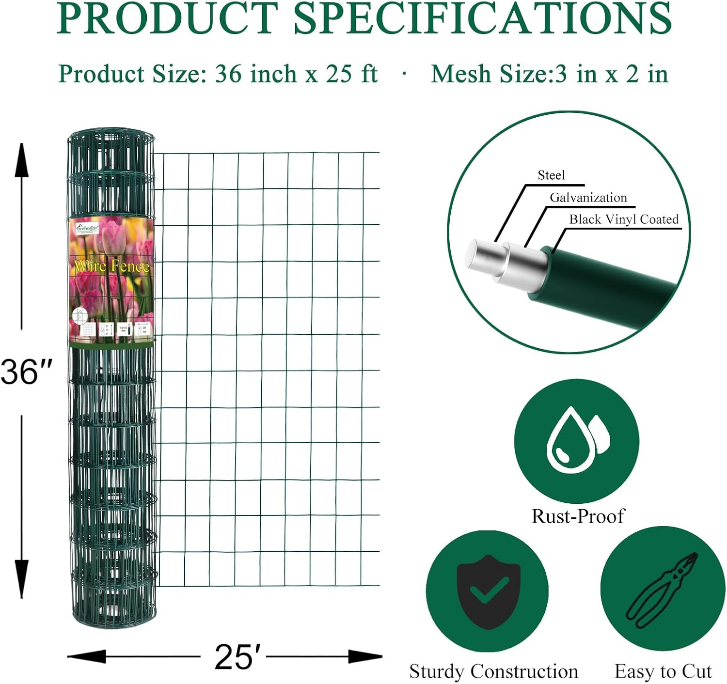- FOREHOGAR welded wire garden fence is made of heavy duty galvanized wire and then coated with green vinyl. Rustproof and with long service life.