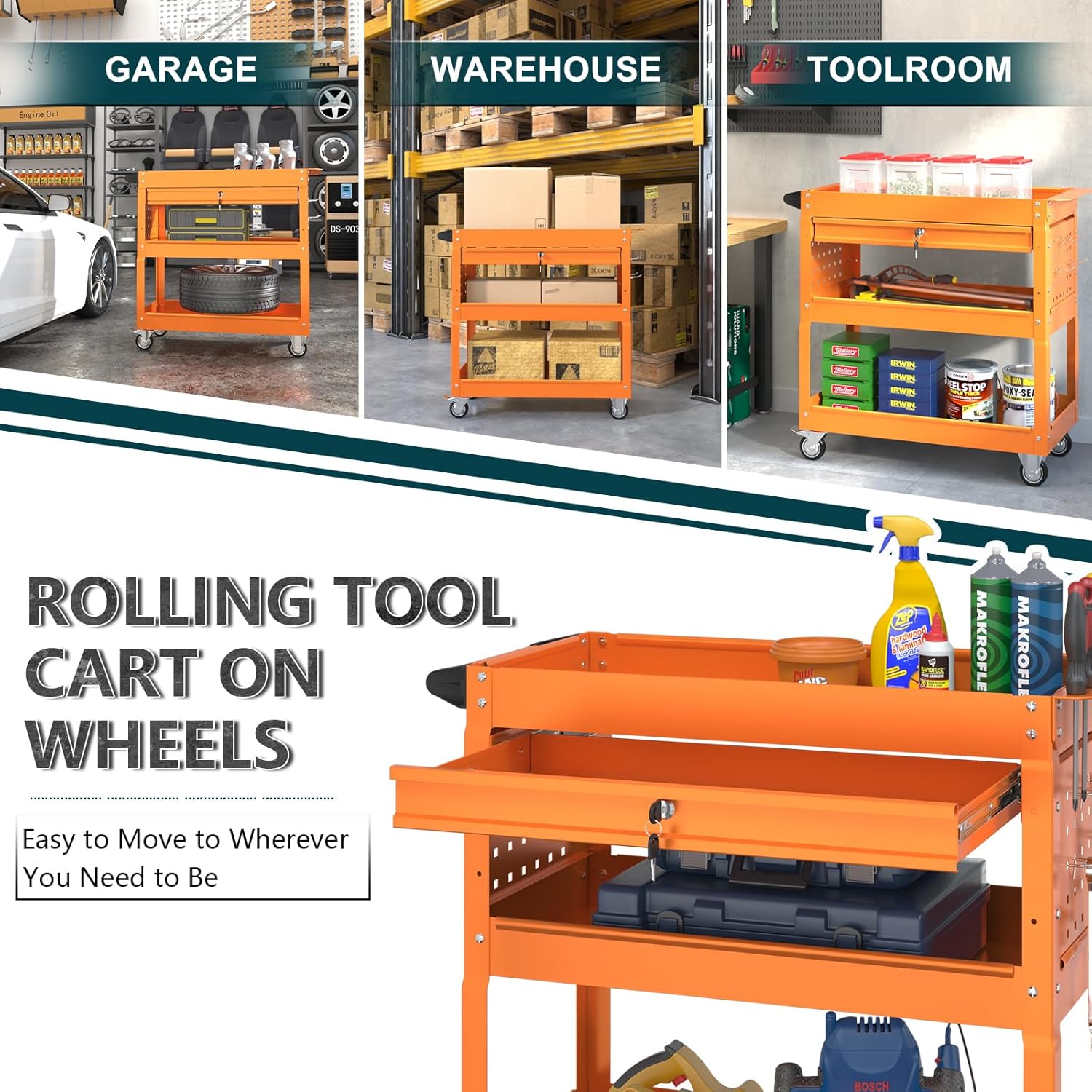 3 Tier Rolling Tool Cart on Wheels with Locking Drawer - Metal Service Cart Industrial Utility Cart for Mechanic - 350 LBS Mobile Storage Organizer for Garage, (Orange)