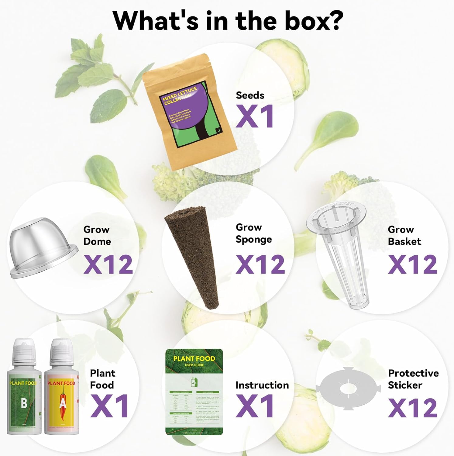 - Everything Your Need: inbloom lettuce herb seed kit not only includs American Fast Lettuce, Parris Island Lettuce, Butter lettuce, Red Romaine Lettuce, but includes 12 grow baskets, 12 sponges, 12 domes, 12 protective stickers, and A&B plant food. With our lettuce seed kits you'll have plenty of seeds to sustainably grow large quantities of lettuce