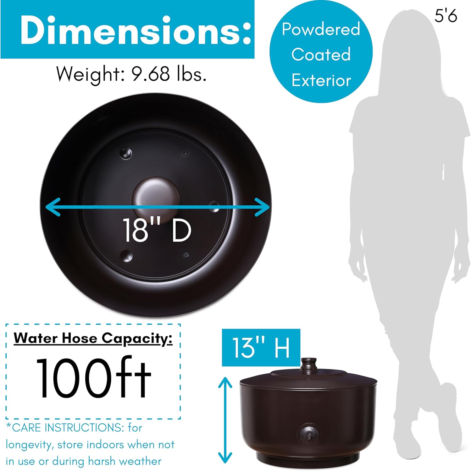 - LARGE CAPACITY STORAGE: The BIRDROCK HOME Water Hose Holder Pot provides ample space, holding up to 100ft of garden hose. This heavy-duty metal container is perfect for organizing and keeping your lawn and patio tidy, while the charcoal finish adds a touch of elegance to your outdoor space.