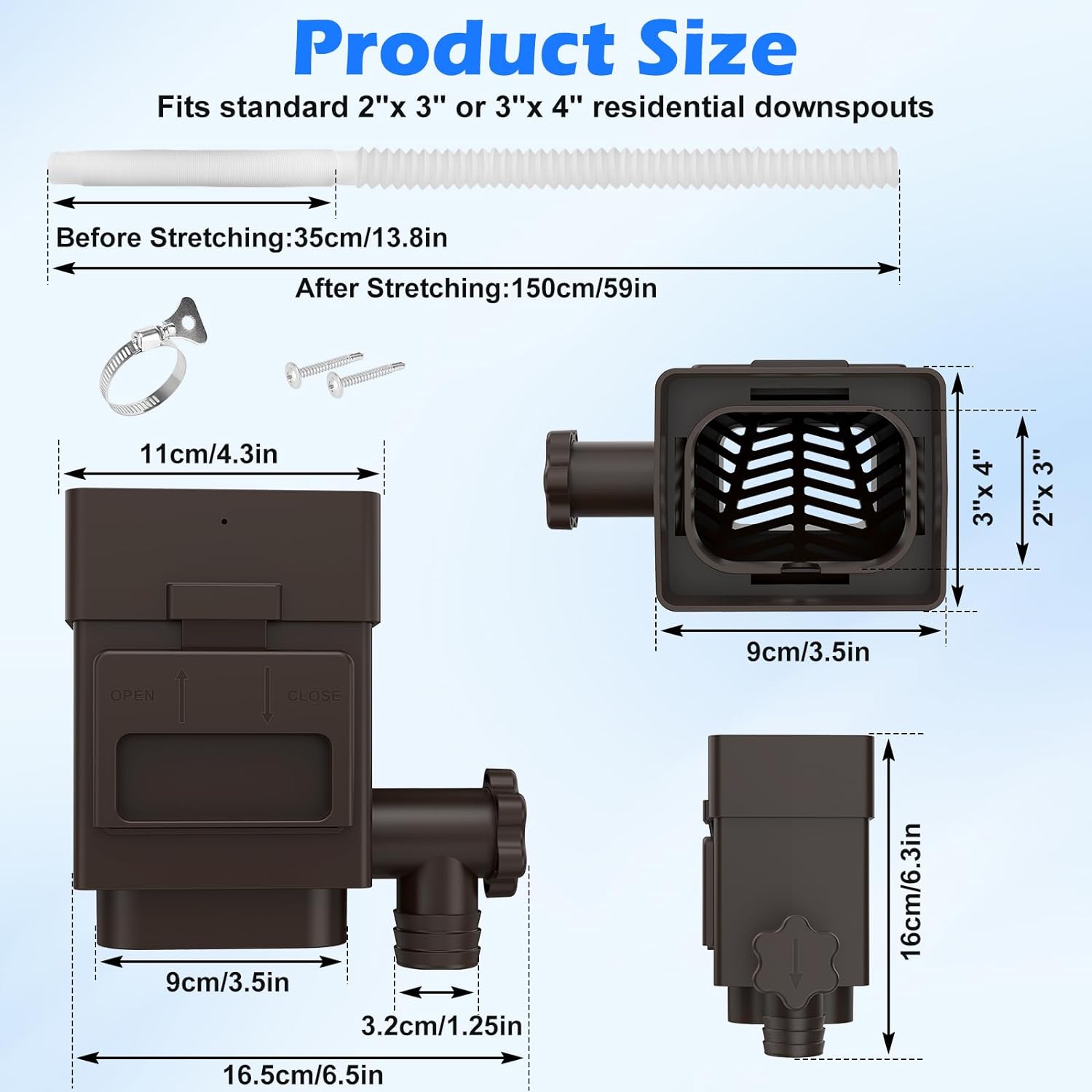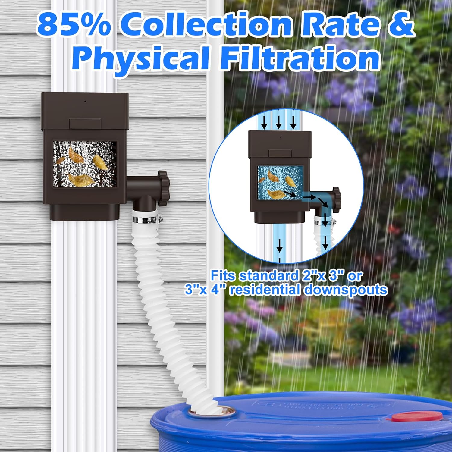 - Compatibility: Fits standard 2"x 3" or 3"x 4" residential downspouts. Please install the rain water catching system 18 inches above the rain barrel.