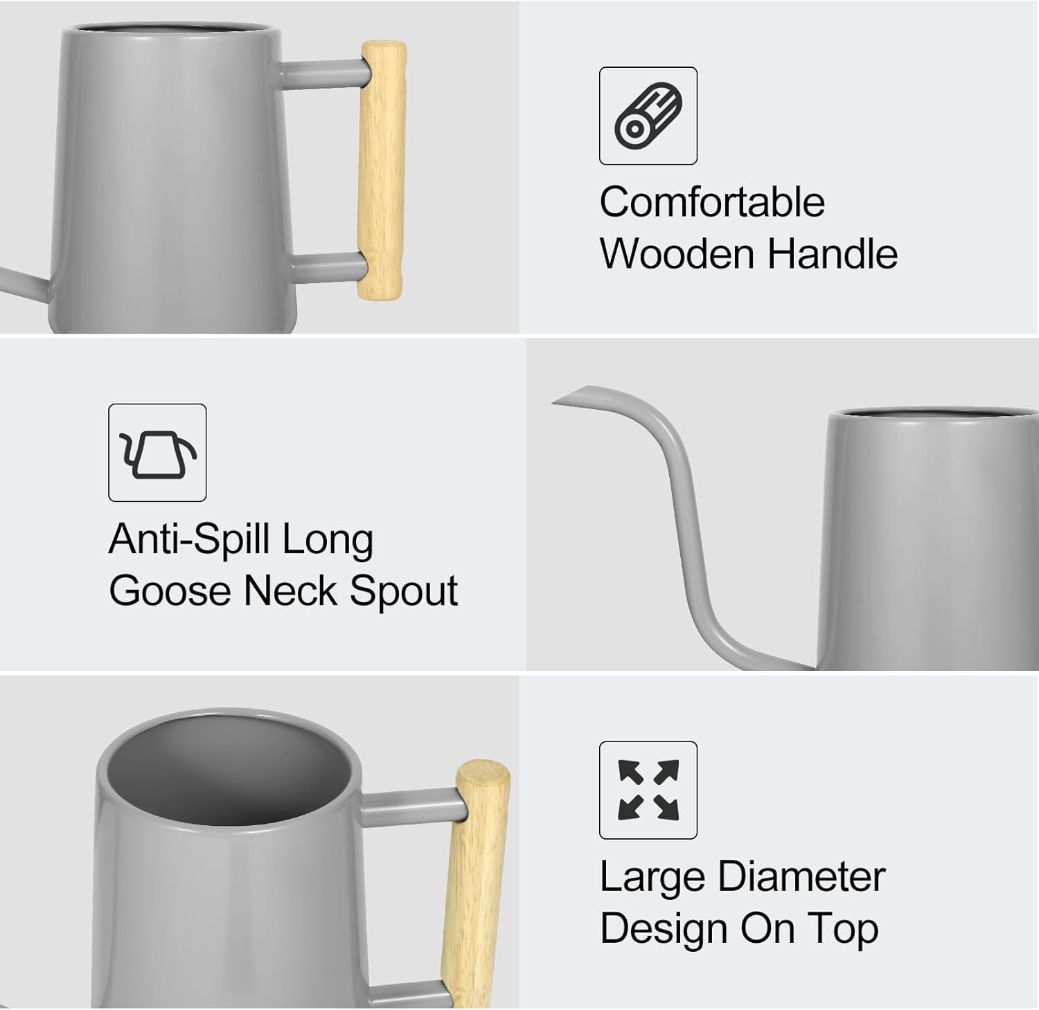 - [COMFORTABLE WOODEN HANDLE] The indoor watering can has a round comfortable wooden handle that is easy to grasp and won't cut your hands.This stainless steel watering can open built-in open top design, it is convenient to refill water