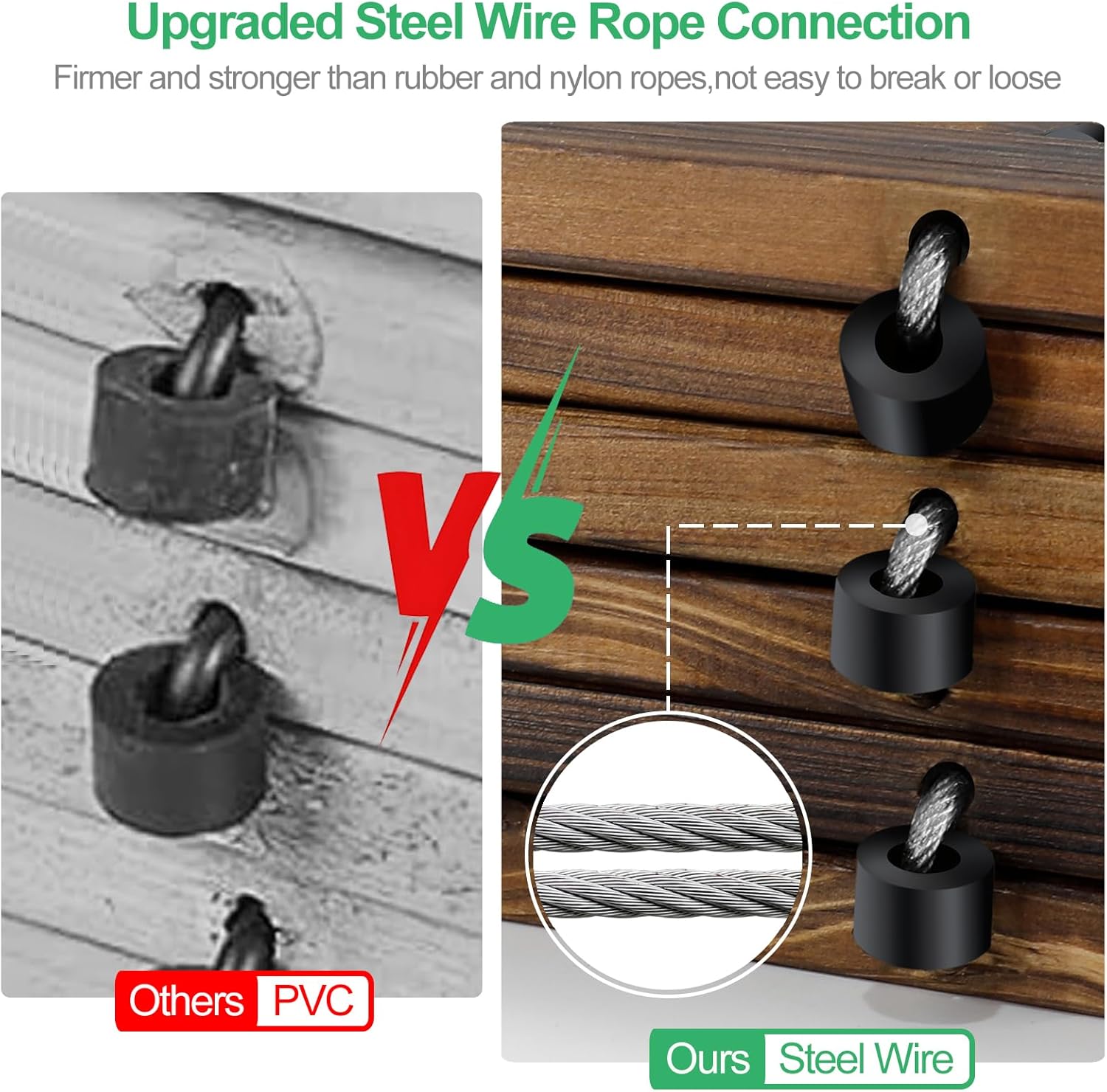 - Firm Steel Wire Rope Connection:Each plank is firmly connected with 2 rows of steel wire ropes and rubber spacers,which are more aging-resistant and anti-loosening than rubber and nylon ropes,while providing better protection to the wood surface!What’s more,this kind of connection gives the garden wooden pathway sufficient flexibility and durability to adapt to all kinds of uneven ground,like beach,grassy road,sandy road,icy road,snowy road,gravelly road,damp or muddy ground,boggy or bare areas