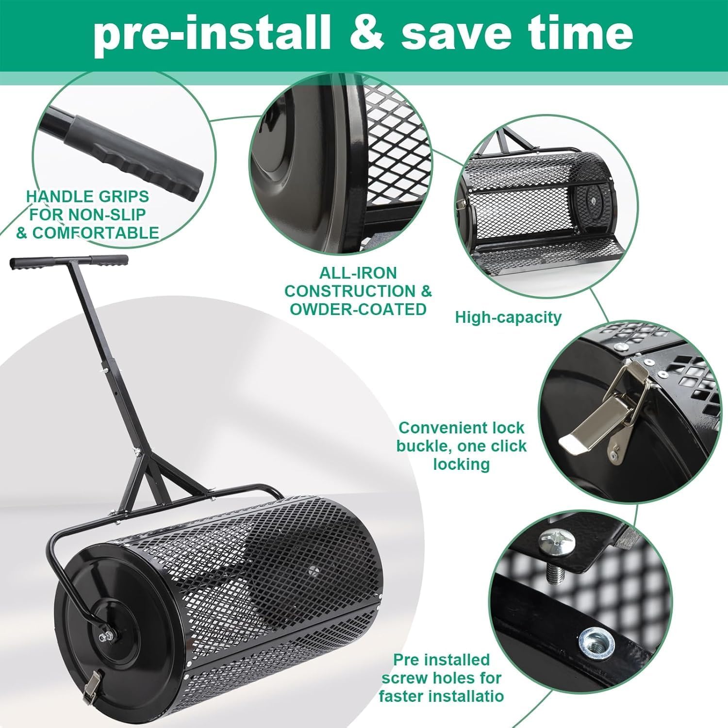 - Easy to use: Install the handle, add compost, lock the latch and roll on the lawn. The latch secures the load and ensures that the basket remains closed during turning and tumbling operations. The fertilizer spreader operates smoothly on different terrains such as slopes, uneven surfaces.