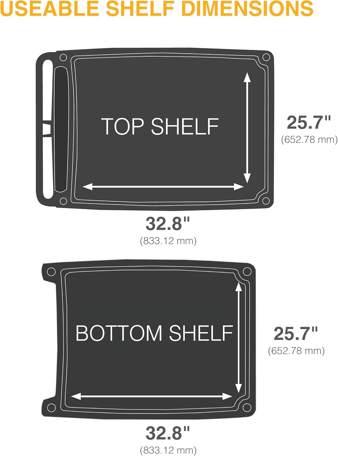 - Built to Handle the Toughest Loads: Maximize storage efficiency in any space with this heavy-duty 2-shelf hauler. With a maximum weight capacity of 400 lbs (181 kg), this cart allows you to conquer tough storage challenges. Each shelf boasts up to a 200 lbs (90 kg) load capacity of tools, supplies, or equipment, keeping everything organized and readily accessible.