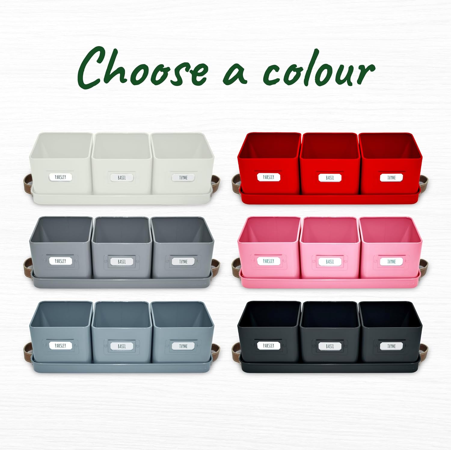 - π» γ Space-Saving γ Enhance your kitchen herb garden with our 3-pack Black indoor herb pots (4.1" x 4.1" x 3.9"). Includes 5 printed and 5 blank cards for organization, a 4.3" x 13.8" x 1" tray, and pots with drainage holes. Perfect for a lively, fresh-scented windowsill garden.