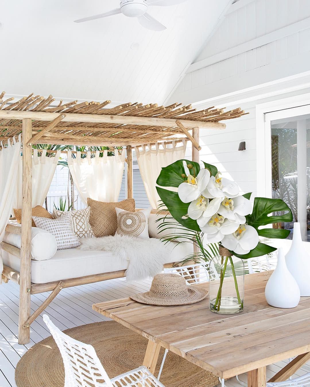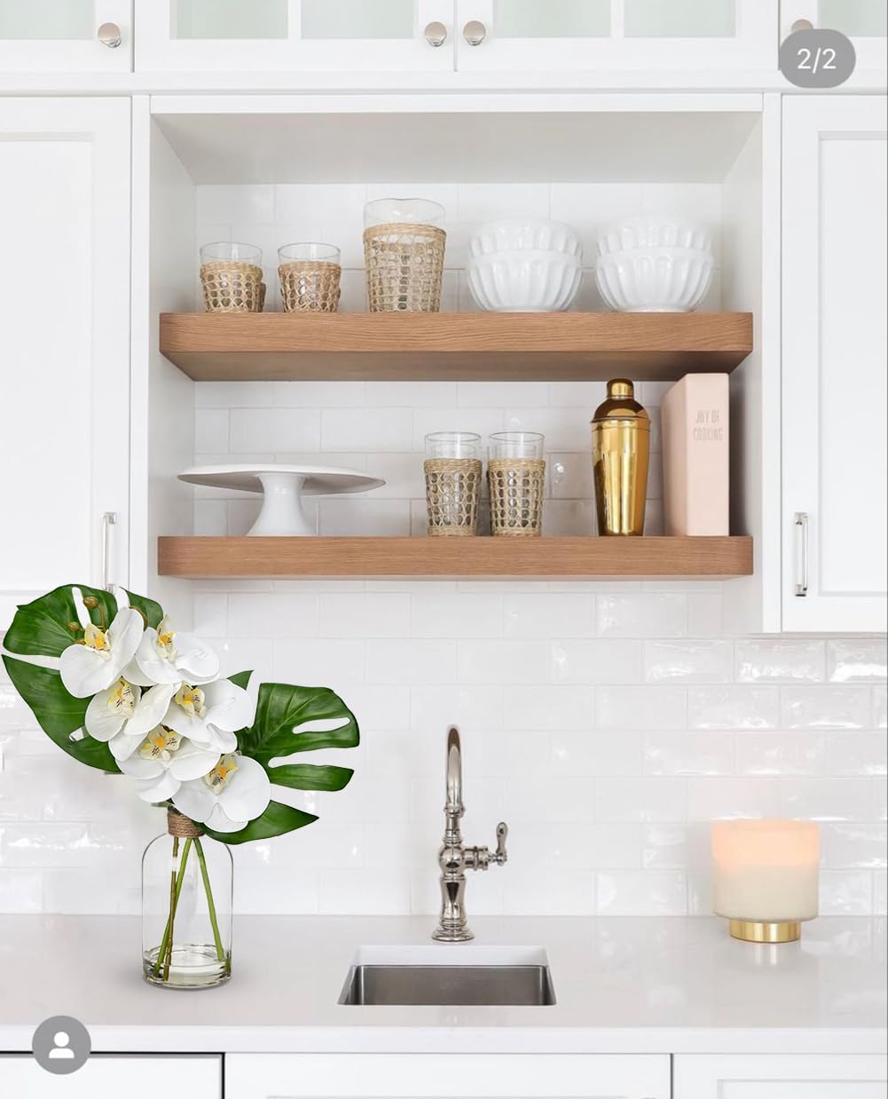 - [Premium Faux Plant] - Featuring 2 big monstera leaves and 2 orchid flowers in a dense arrangement, this design is completed in a glass vase with fake water. The addition of a hemp rope adds a chic tropical style to this fake potted plant.