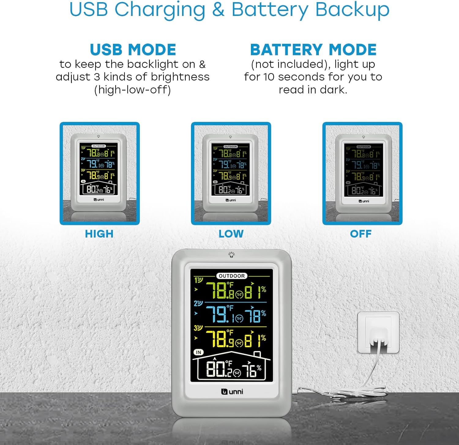 - DISPLAY 3 SENSORS DATA, TRANSMISIION 328FT/100M – Unni has advanced patented wireless technology that provides more powerful and steady data transmission. Wireless temperature humidity monitor updates and transmits temperature and humidity data up to 330 ft radius every 30 seconds, that will help you monitor all the locations you care about the most.