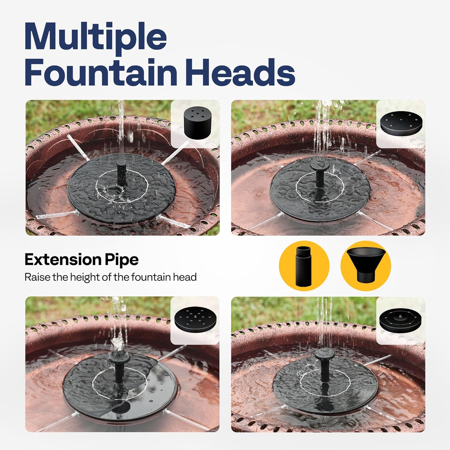 - COMBO SET: This package includes a 5-forked bird bath, a 1.4 W solar water fountain, and four different spray nozzles; The fountain can be configured to create a beautiful display with four different patterns, which may attract and entertain birds; The bird bath set is a suitable and lovely addition to any garden, patio, yard, deck, or other outdoor space