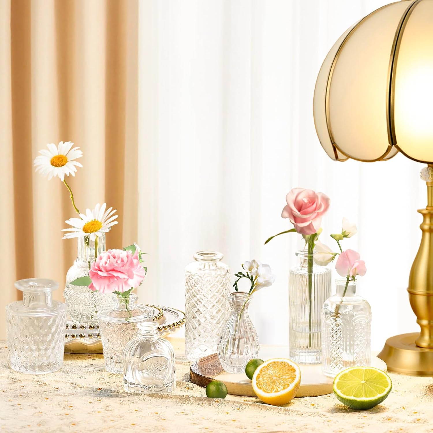 - Thick and Sturdy: Our glass vases bulk is made of thick and sturdy glass, strong and not easily broken. Each small glass vases floreros has a thickened base for stability, and the textured pattern on the surface of small vases for flowers adds a unique touch, injecting an element of sophistication to create a fun and captivating visual effect.