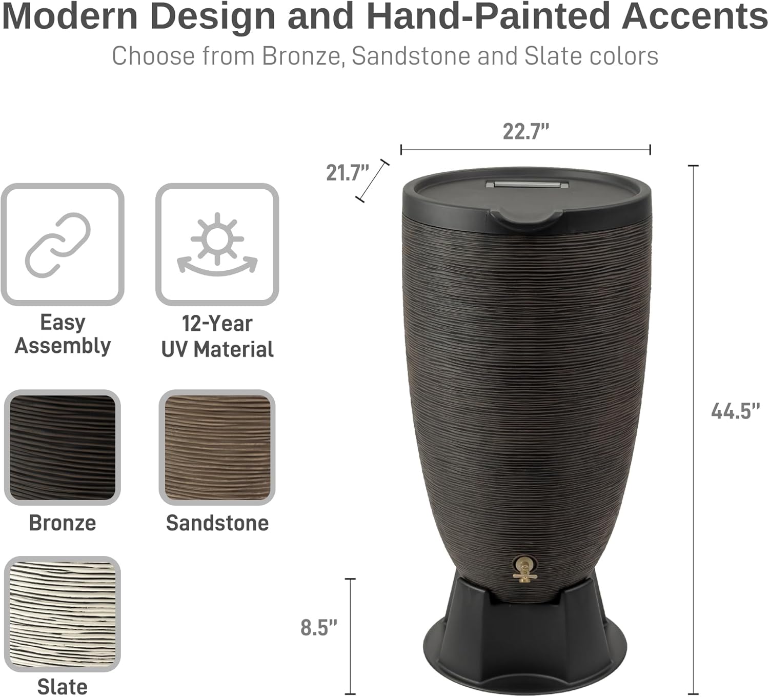 - Convenient Stand: The included stand raises the barrel spigot, making it easier to fill watering cans and other containers. Additionally, the sturdy base provides stability, ensuring your rain barrel stays securely in place.