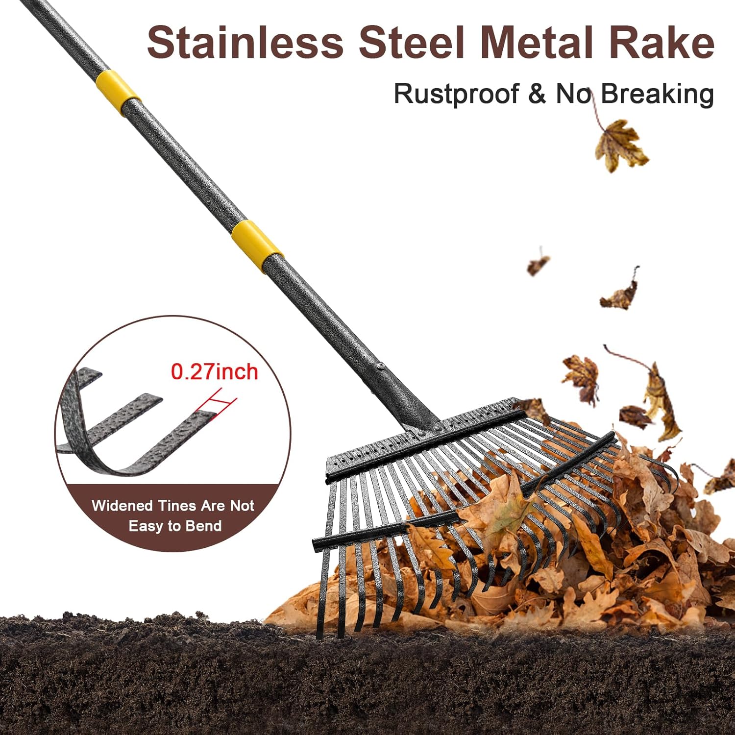 Metal Garden Rake, 6FT Rake for Leaves Lawns, 25 Metal Tines 18 inch Wide with Adjustable Handle Heavy Duty Yard Leaf Rakes for Gardening