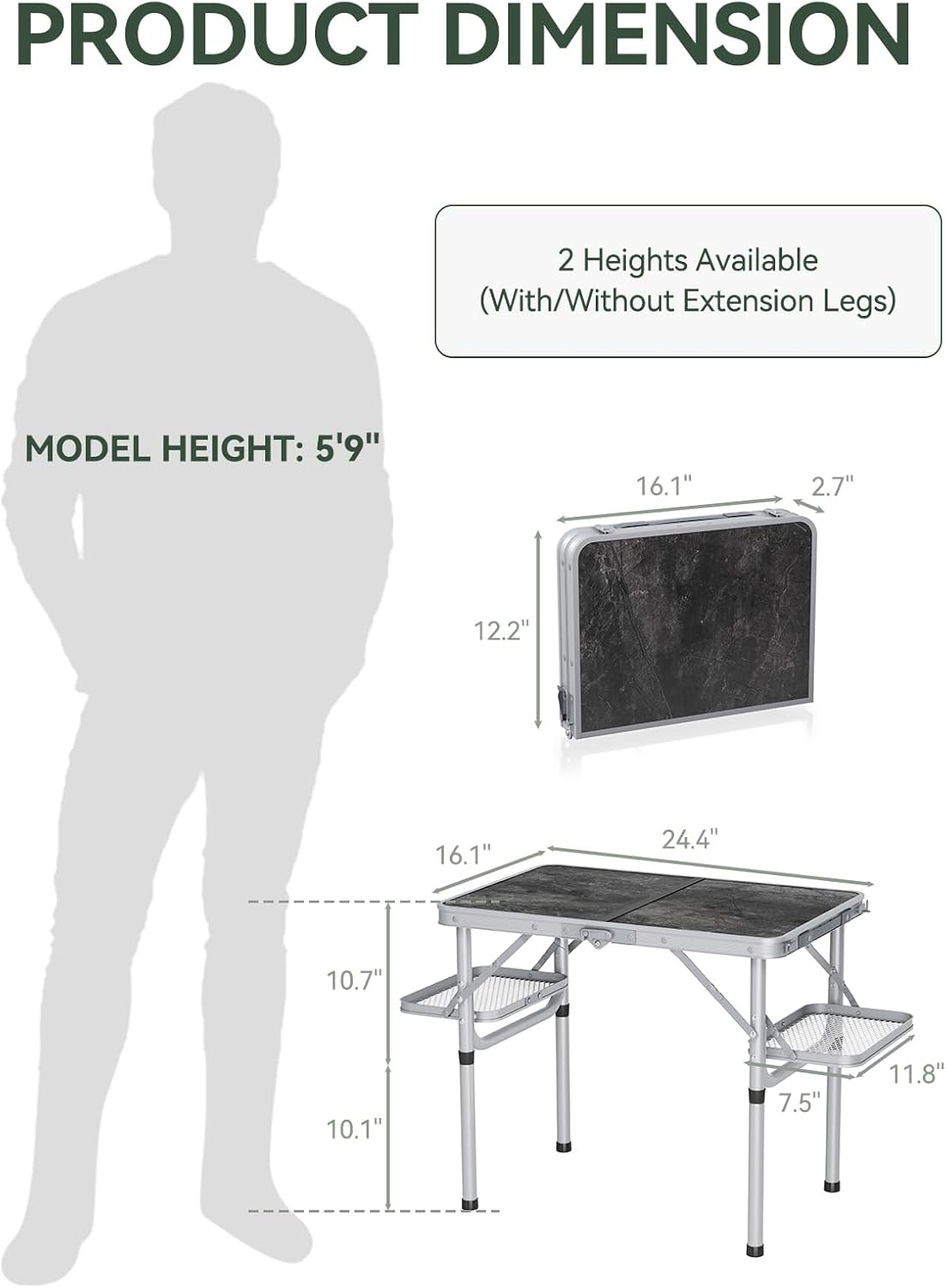 - Lightweight & Strong Load-bearing. Our folding camping table is made of 90% aluminum & 10% density board, ensuring that it is light and strong at the same time. The picnic table is 6lbs heavy and supports up to 70 lbs, and each wing supports up to 20 lbs.