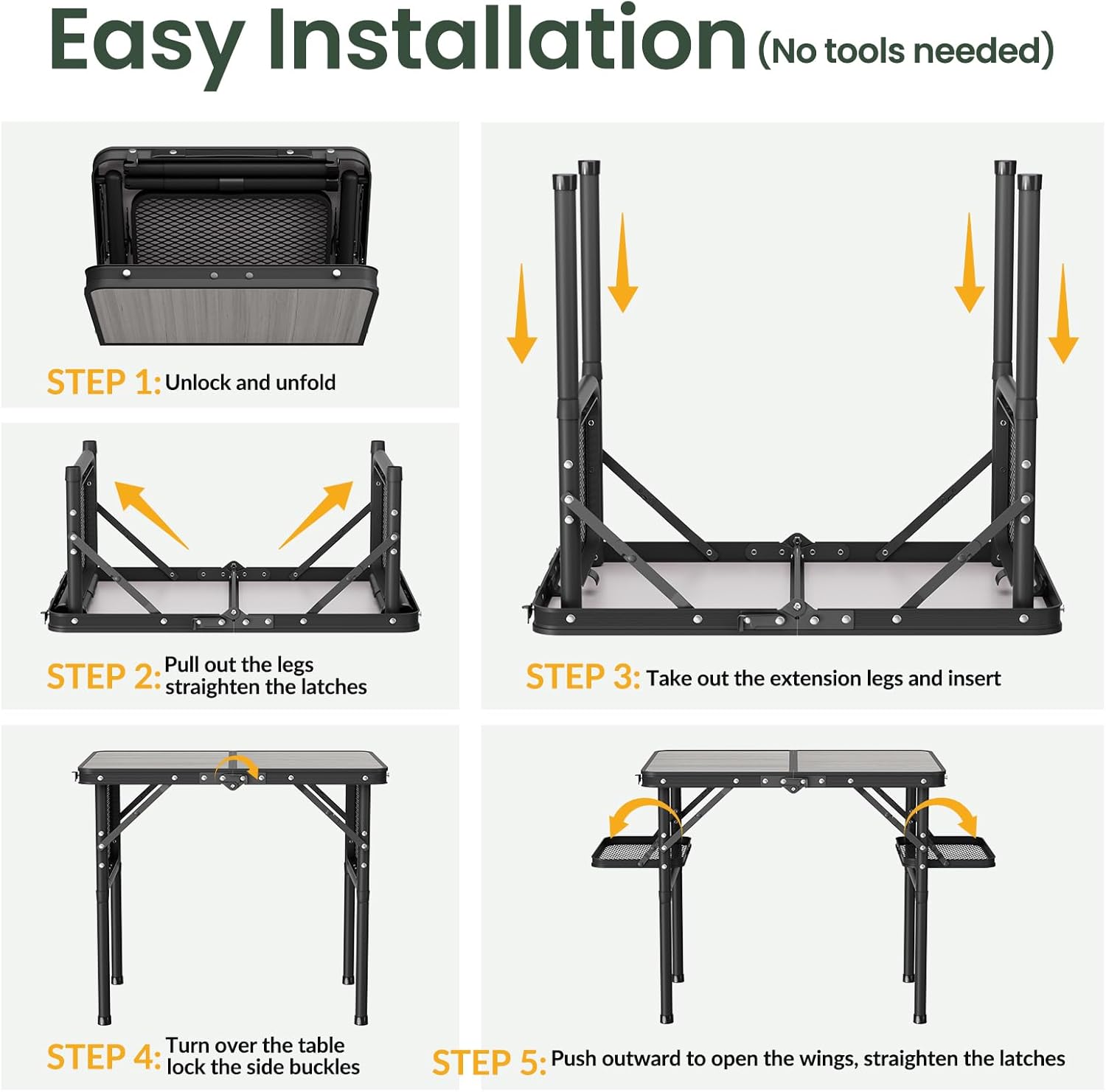 - Simple 5-step Installation (No tools needed). Step 1: Unlock and unfold. Step 2: Pull out the legs and straighten the latches. Step 3: Take out the extension legs and insert. Step 4: Turn over the table and lock the side buckles. Step 5: Push outward to open the wings, straighten the latches. Done. Please refer to the installation steps in the picture.