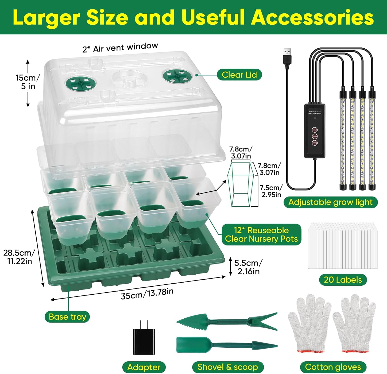 - 【360°Spectrum Grow Light】 Larger grow light cover spectrum for better seedling grow, this product has upgraded 4 full spectrum strip plant growth lights insert on the Dome of the plant starter kit, and also has improve the light. Now you can adjust and timed the light as you need, you don’t have to stay at home ! White& blue Light will help seedling growing faster and better. You can use this product by USB port or just plug-in,3 lighting modes & 4 timing functions (3H/6H/12H/18H) & 5 brightness modes, providing a better garden tool for anyone!