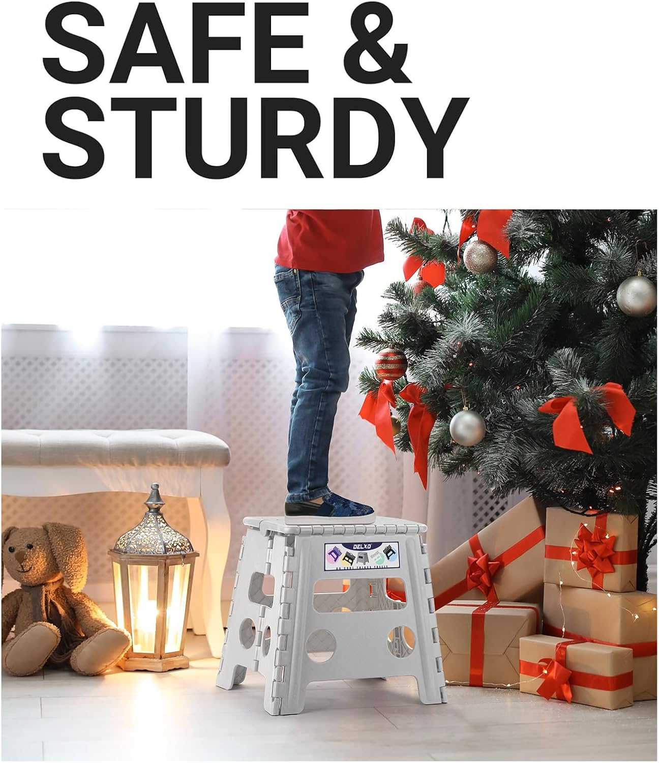 - Sturdy & Safe Foldable Step Stool : Our folding step stool is handy to have around for all sorts of occasions. Compact at 13"H×14"L×11"W when opened and 17.5"H ×13"L×1.2"W when folded, this durable and strong plastic step stool can support up to 300lbs. It is lightweight and versatile, and can be used both outdoors and indoors in the kitchen, bathroom or office