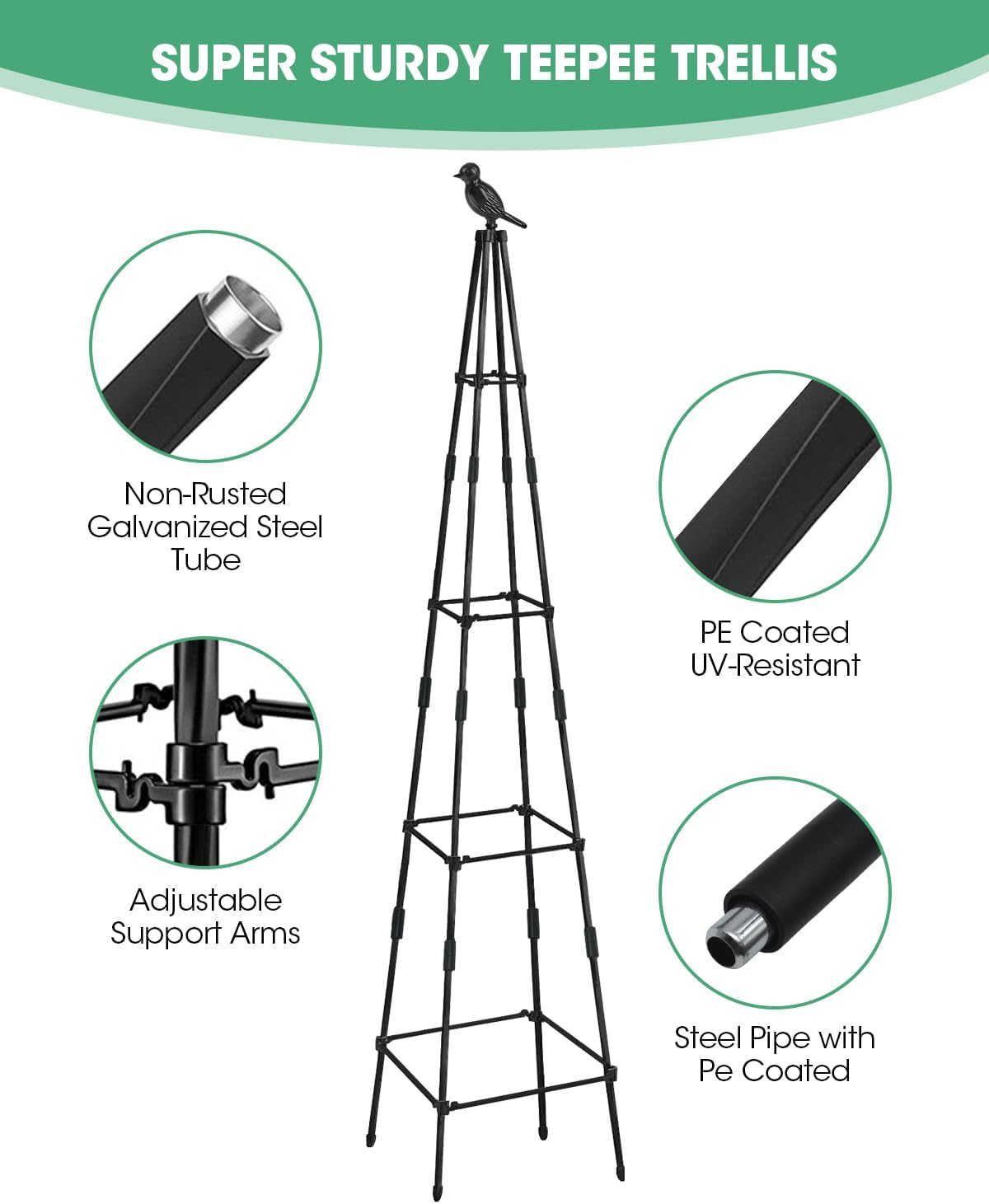 - Rustproof Material & Strong and Sturdy: Material of our garden obelisk trellis: Metal Pipe with PE Plastic Coating, can prevent the inner iron pipe from rusting, waterproof, sun protection, durable and long service life. It is permitted outdoors or indoors for climbing plants, potted plant, flowers, tomato etc.
