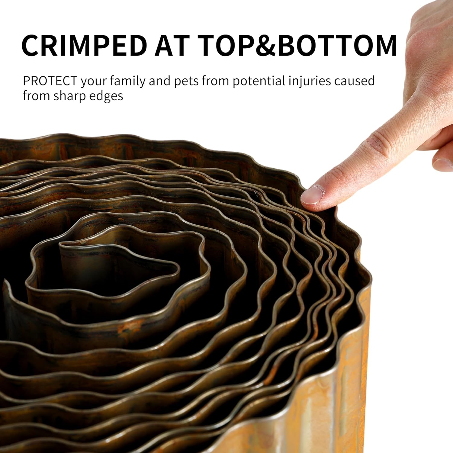 - PRE-RUSTED: This lawn edging has been pre-rusted; No need to wait, get a beautiful rusted patina right away; This metal corrugated garden edging with hemmed edges can create a raised layer of mulch, rocks or soil and provides style and safety for your garden, lawn and flower beds.