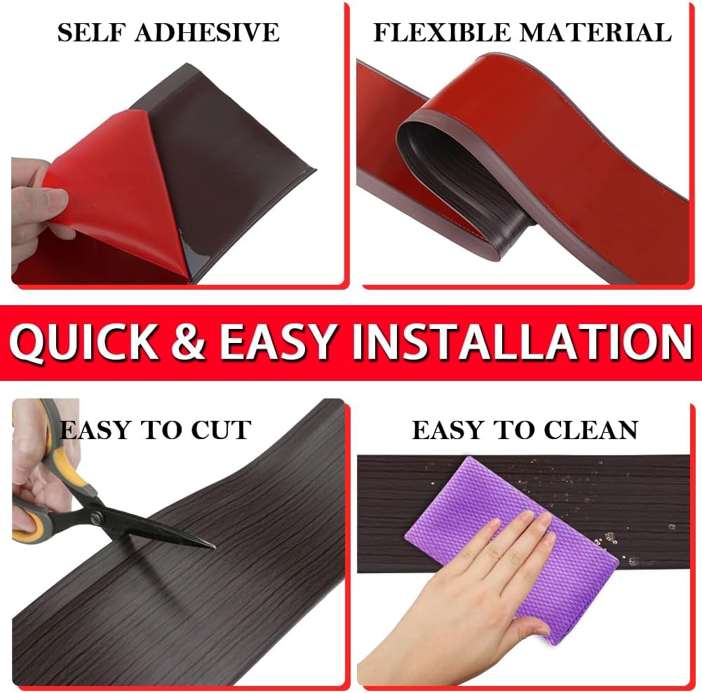 - Quick Installation: easy to use without screws or drilling required. Measure and cut to the desired length, peel off the backing tape of the self adhesive vinyl baseboard and stick it to a smooth surface after wiping, firmly press with roller tool back and forth to achieve the flatness effect and secure grasp after installation.