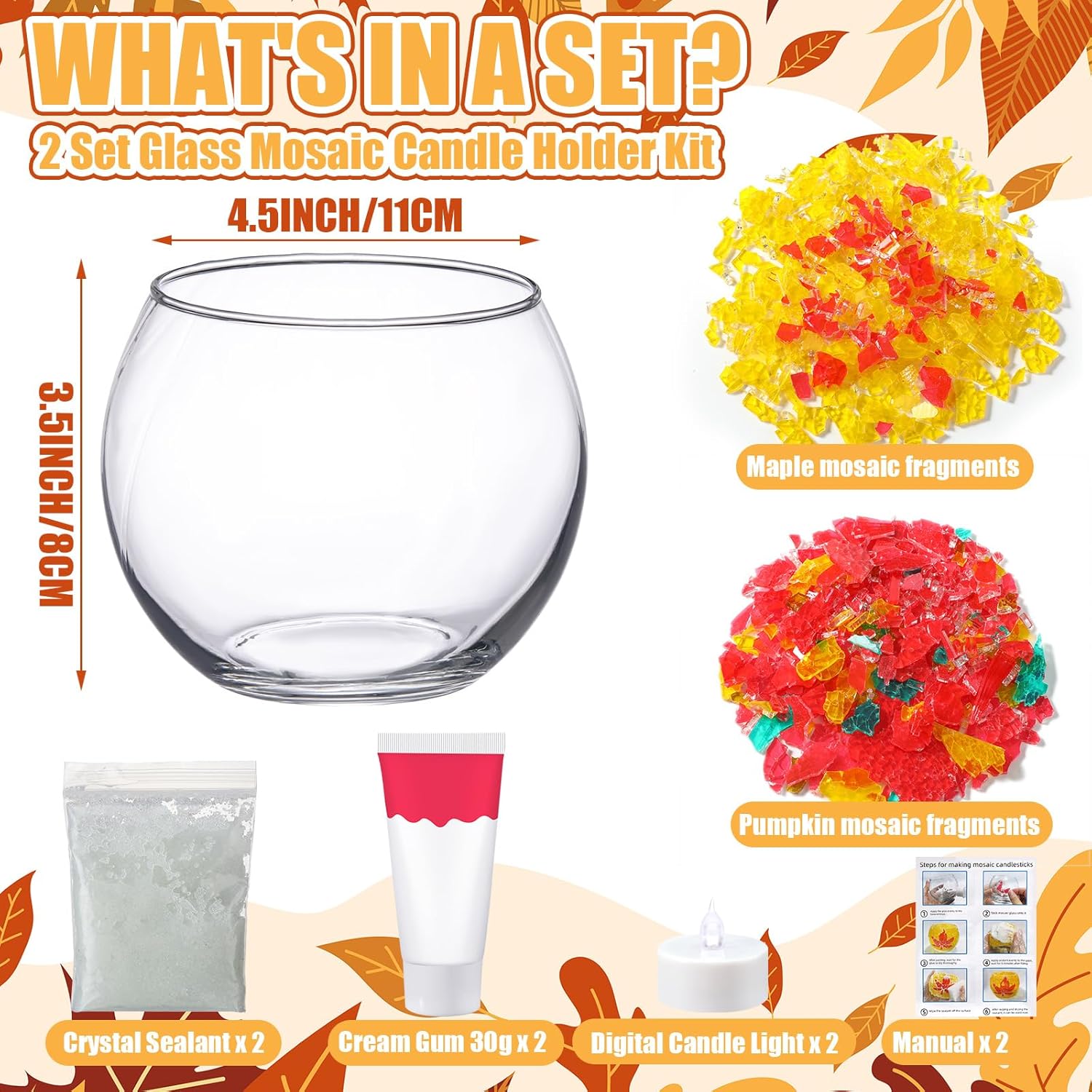 - Complete Package: the glass mosaic kit comes with 2 sets providing double the creativity opportunities, fall candle holder includes glass jar, candle, mosaics, cream glue, cleaning sponge, crystal caulk and Instruction manual; These mosaic art kit give you all the tools needed to create elegant, unique candle holders; It's a comprehensive package for anyone with a creative inclination