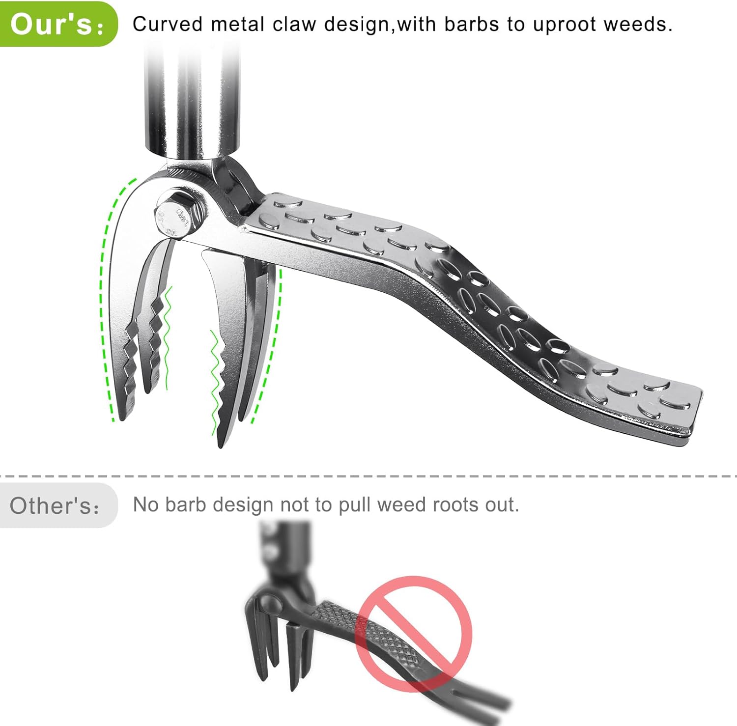 - Innovative Curved 4-Claw Head: The unique curved design with serrated, non-slip teeth ensures efficient weed removal from any angle and depth, protecting surrounding plants and soil.