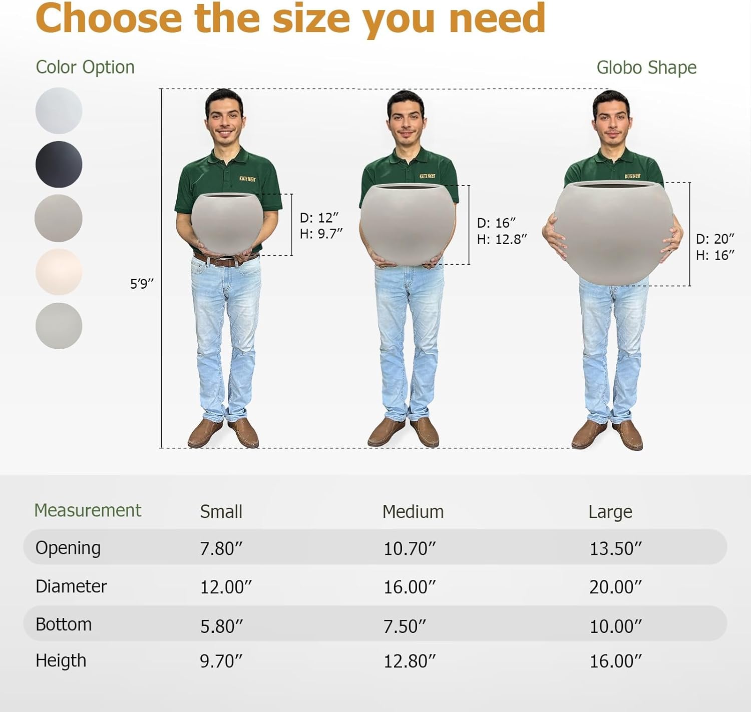16" H x 20" D Globo Fiberstone Round Planter with Drainage Hole, Weather Resistant, Smooth Finish, Planters for Indoor Plants & Outdoor, 2 Extra Coco Mats (Taupe, 13.5" Pot Opening)
