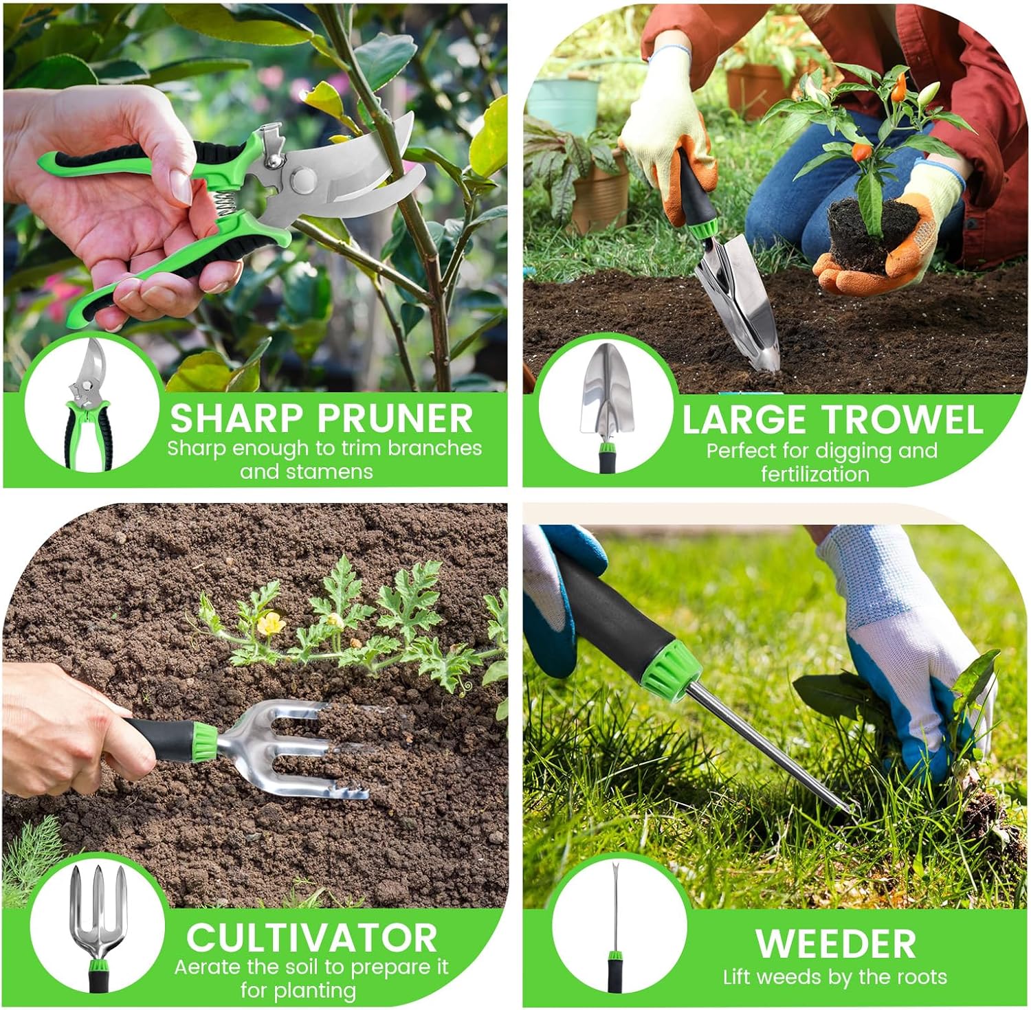 - ăTwo Removable tool bag & 4 Heavy Duty Garden Toolsă The gardening tool sets includes a large trowel, cultivator, weeder, pruning shears and an Oxford cloth Tool hand bag+tool pouch to keep all your tools packed away provides everything you need to maintain a beautiful and healthy garden.