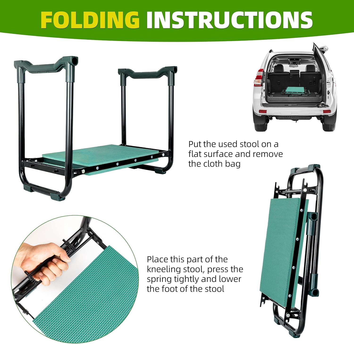 - ăPortable & Stableă:The garden kneeler and seat adopts a scientific structure and the legs of this garden bench has non-slip design to ensure you stay stable while kneeling or sitting. What's more ,Our garden seat is foldable and lightweight (5.4 LBS), you could take it anywhere easily and conveniently with one hand. Garden kneeler can also be stored in any corner, portable and space saving.
