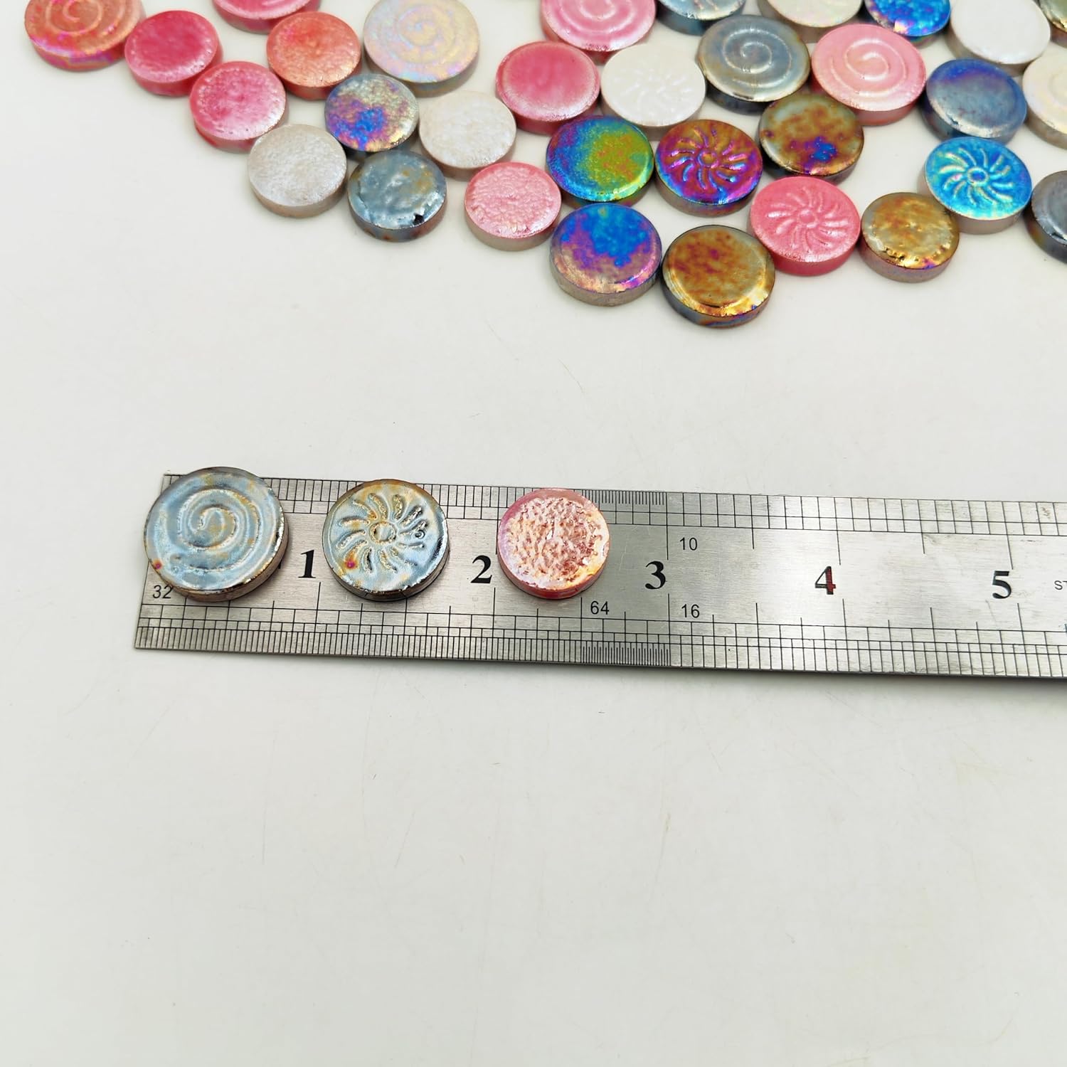 - The Round Ceramic Mosaic Tiles 3 Size: Large Dia,:2cm/0.787inch; Medium Dia.:1.8cm/0.708inch;Small Dia.1.5cm/0.59inch;Thickness: 0.4cm/0.157 inch;About 200 PCS Mix 3 Sized Random Round Mosaic Tiles in a PP Bag