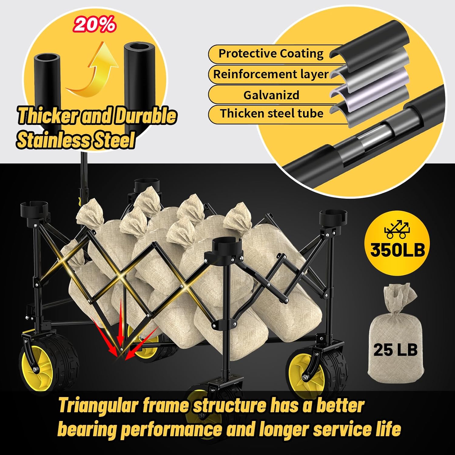 Collapsible Extended Wagon with Big All-Terrain Wheels 350LB& Oversized Outdoor Heavy Duty Utility Garden Cart Foldable Large Beach Wagon for Sand Fishing Camping Portable Grocery Pull Cart