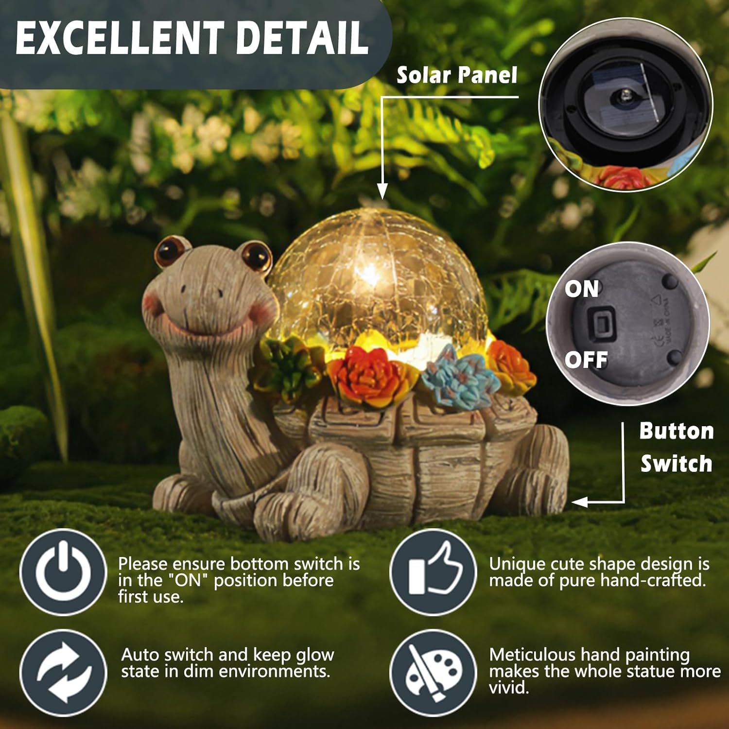 - 【AUTO SWITCH】 Turtle solar statue light with built-in solar panels, keep working time up to 8-10 hours, randomly placed during the day when there is sunlight, 360 ° can easily absorb the sun's energy, only 6 hours full charged will be able to bloom beautiful light all night