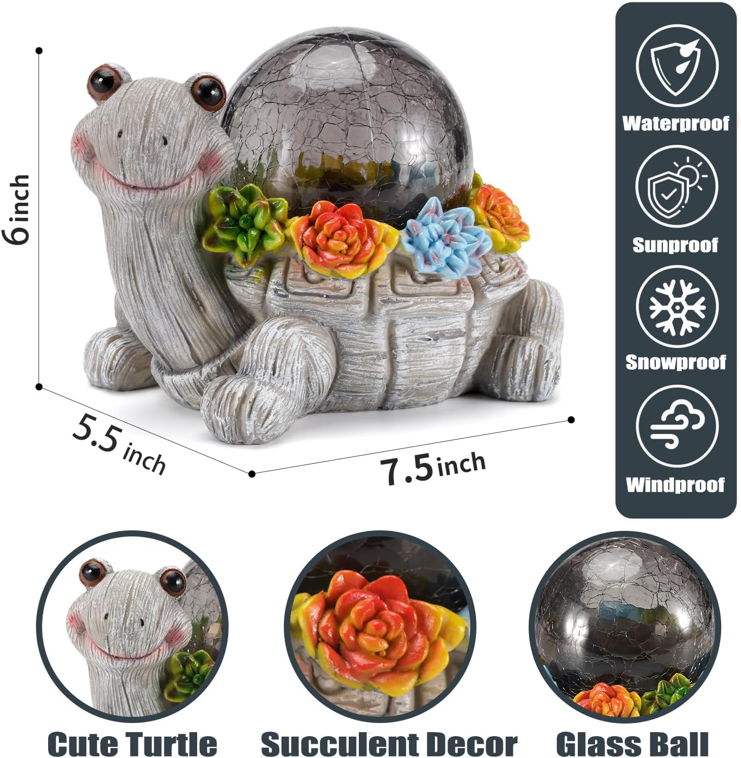 - 【CUTE APPEARANCES】Charming solar turtle statue is chic and interesting, Unique turtle head is always smiling towards you to help you relax the fatigue and bad mood of the whole day. Exquisite succulent plant carving with a glass globe lampshade, no matter day or night is the perfect outdoor decoration for your garden