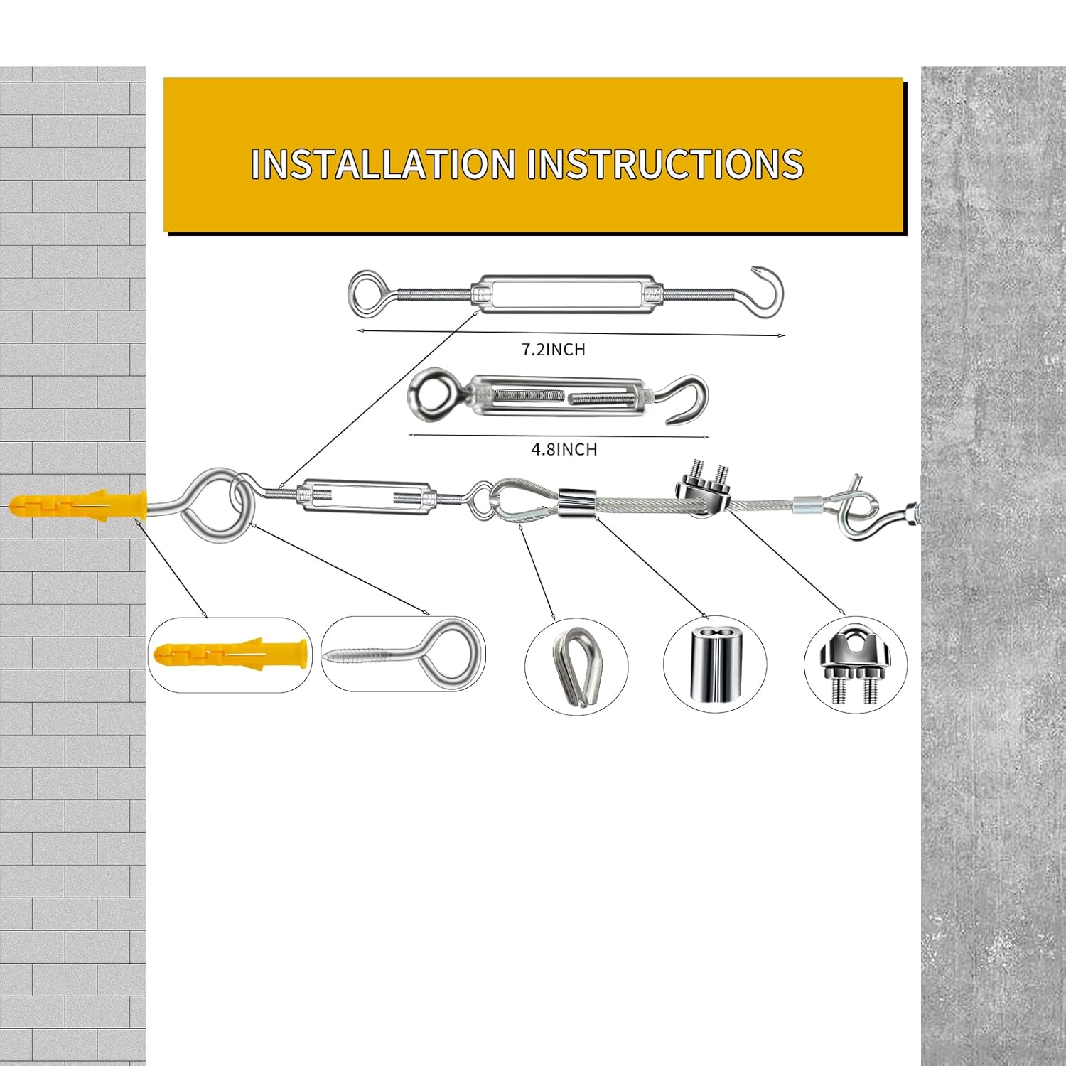 - 【Easy to install】: spring snap hooks for quick and secure connections,eye hooks with screws and wall anchors for a variety of anchoring options.8 wire rope clips that are designed to securely fasten the cable at any point along its length.10 aluminum sleeves and 10 wire rope thimbles to provide a smooth and snag-free cable path.5 adjustable turnbuckles included,you have the flexibility to make precise adjustments to the tension of your wire rope setup.