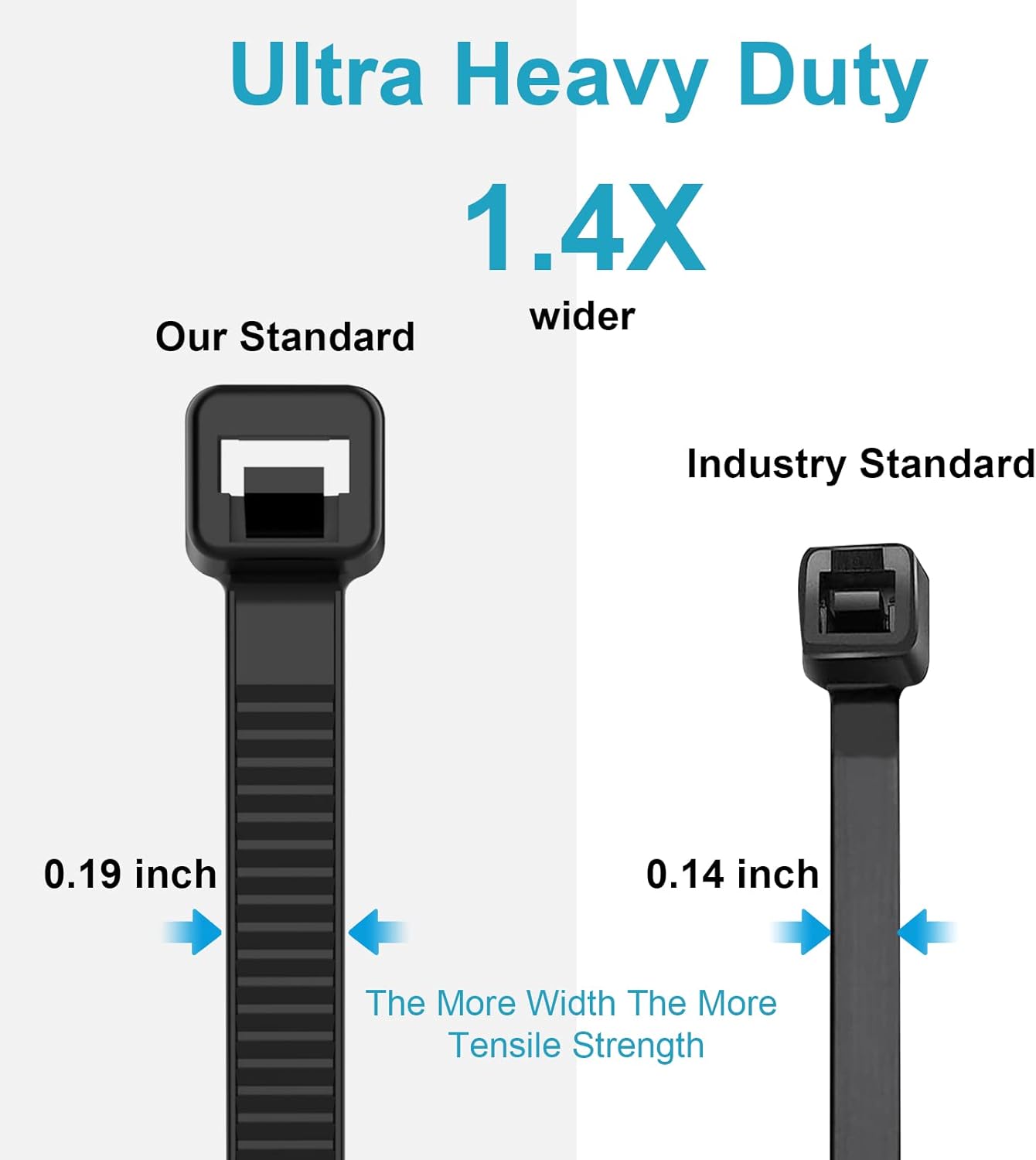 - 【85lb Tensile Strength】: The more width and Thickness, the more tensile strength. our zip ties 14 inch width is 0.19 inch(4.8mm), while industry standard is 0.14 inch(3.6mm), our zip ties 14 inch Thickness is 0.065" inch(1.65 mm), while industry standard is 0.05 inch(1.25mm),more tensile strength.