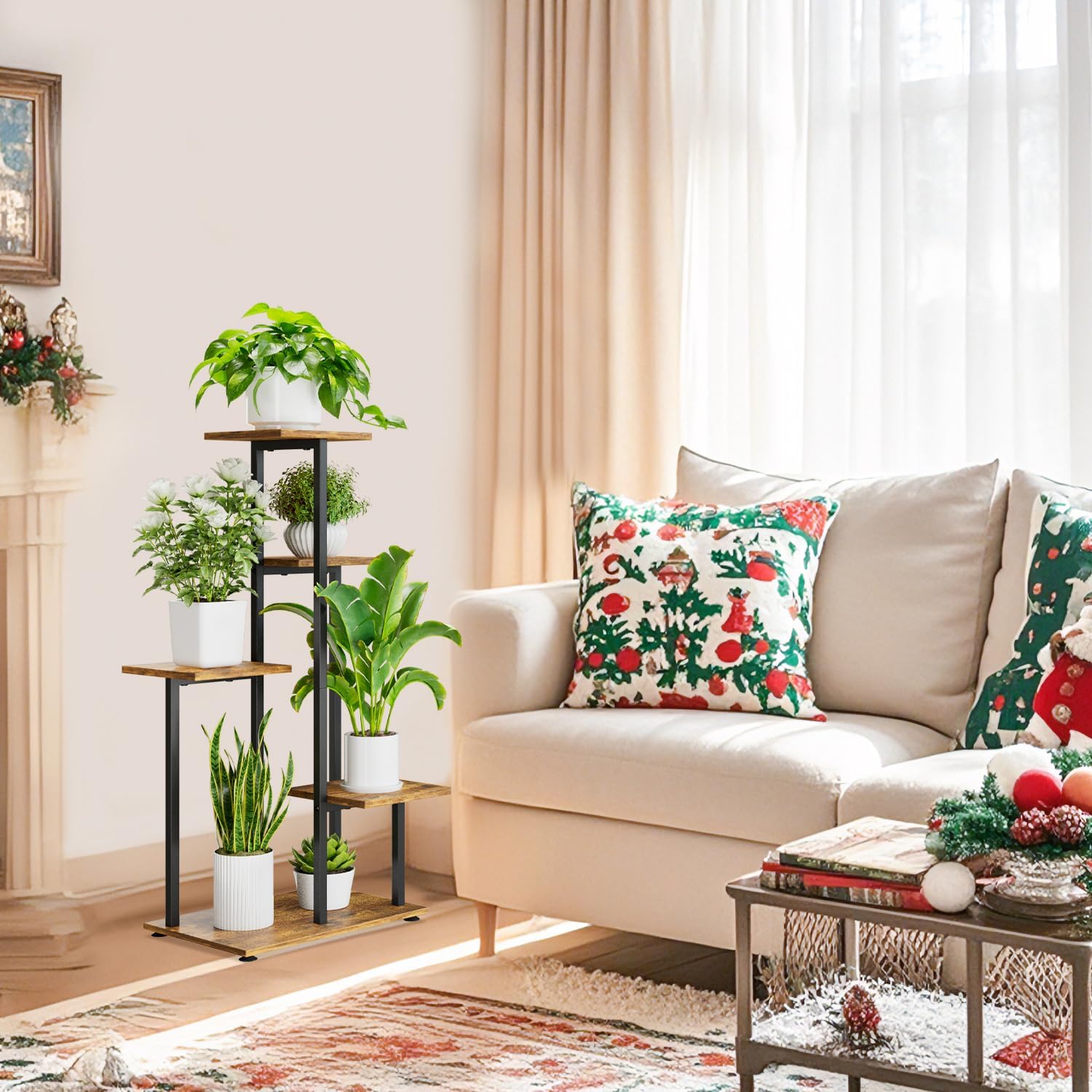 iDavosic.ly 5 Tier Plant Stand Indoor, Tiered Corner Flower Holder Shelf Outdoor, Metal Wood Tall Orchid Pot Display Rack for Patio Porch Garden Balcony Office, Modern Black & Rustic Brown