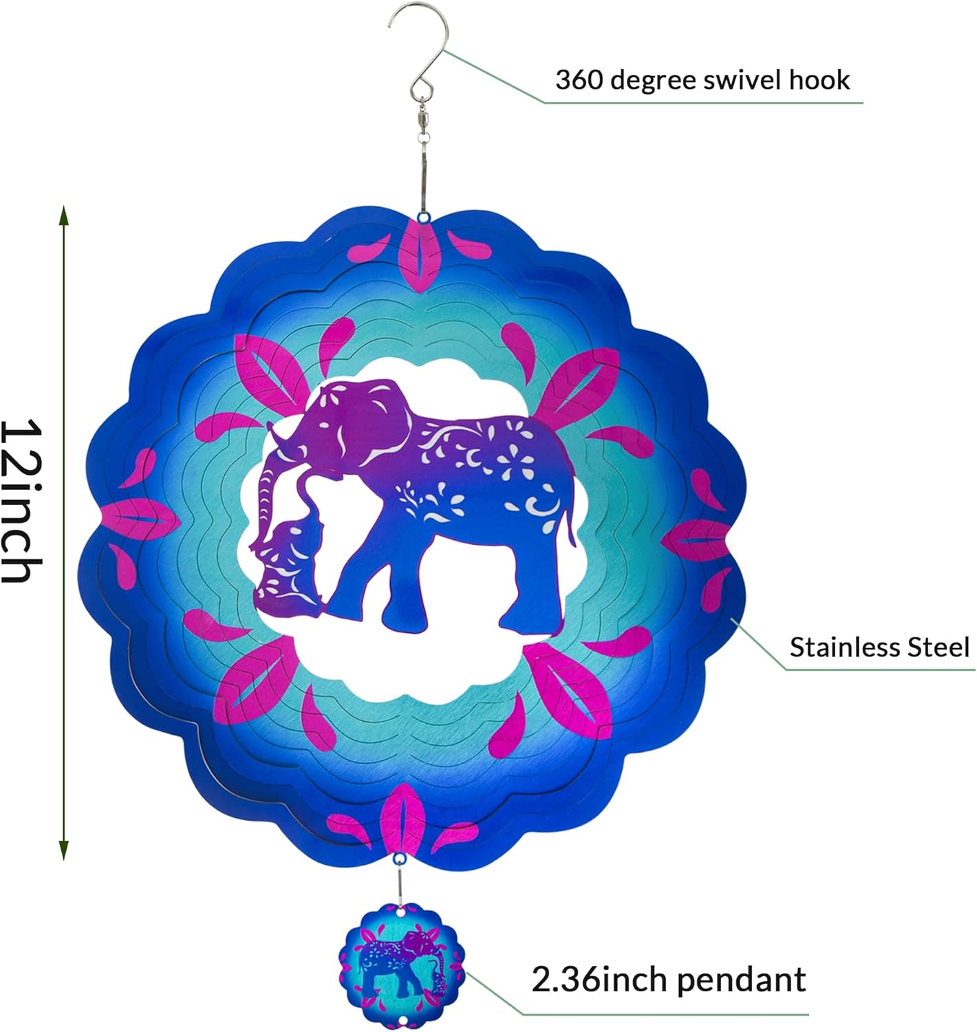 - 【Product introduction】: This 3D wind spinner is made of 12 inches and made of high-quality stainless steel. which adopts cutting technology and PUV printing to achieve a vivid elephant shape.