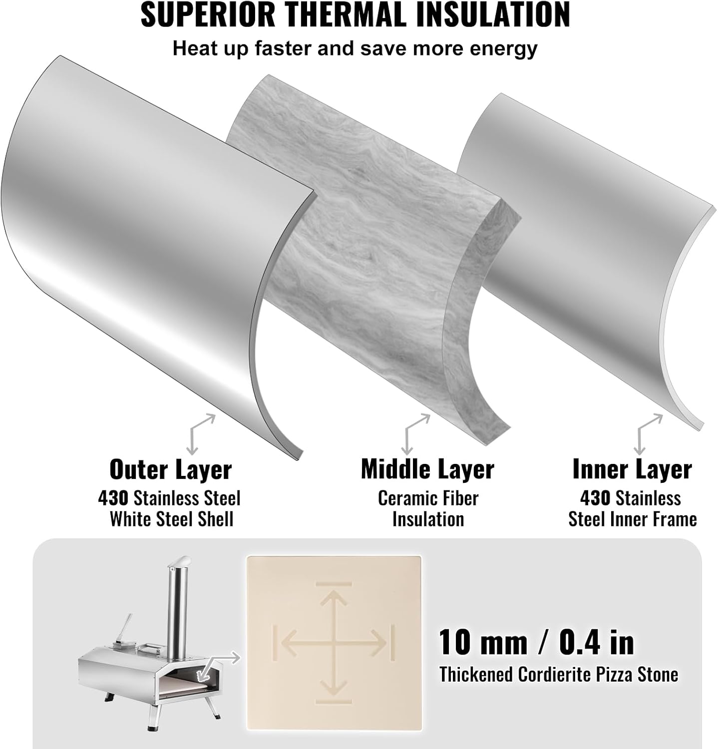 - ๐ Durable Construction: VEVOR multi-fuel pizza oven withstands outdoor conditions and frequent use. Adopted a 3-layer design, promoting efficient heat circulation. Featuring a 430 stainless steel shell, and thick insulation cotton, it ensures durability and excellent heat retention
