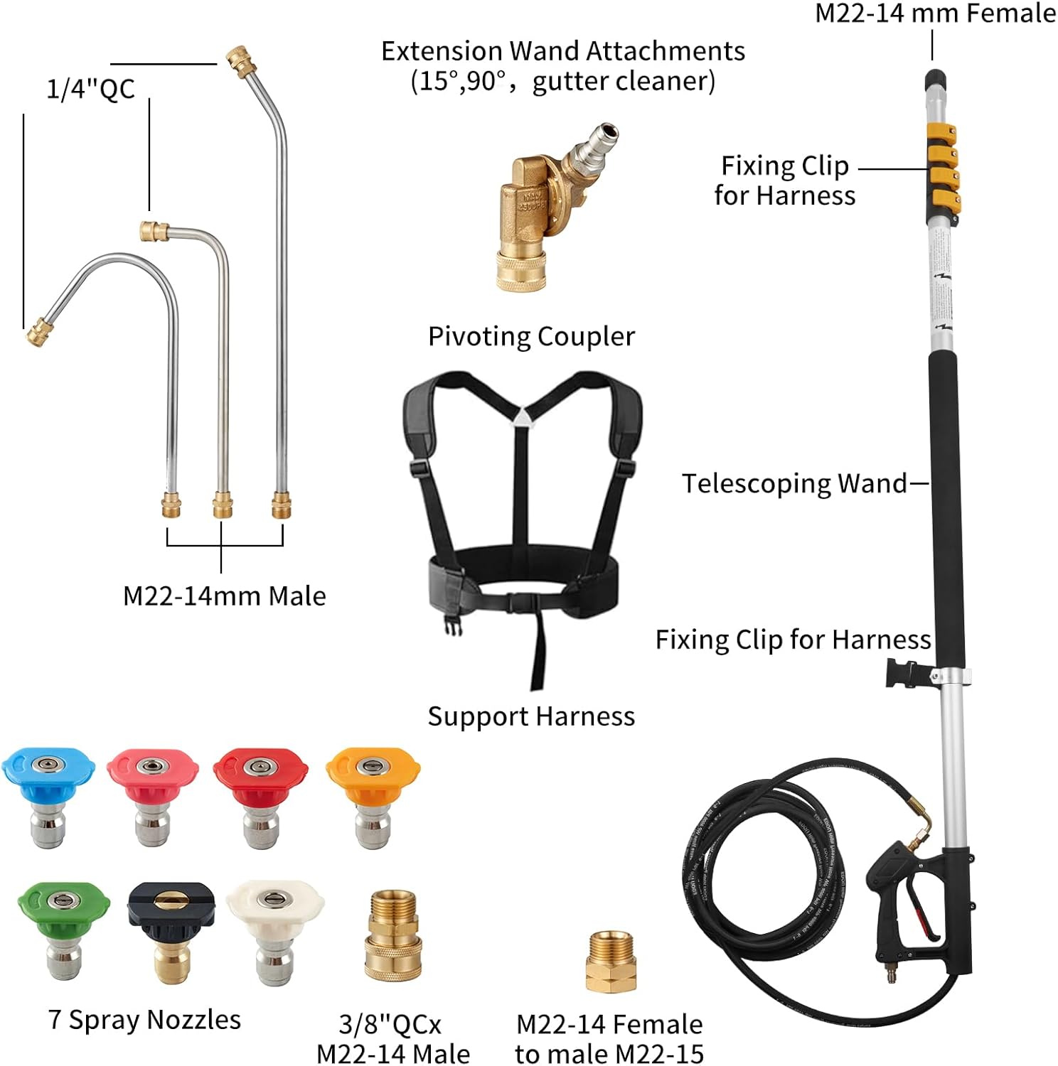 - ăEssential Accessoriesă3 extension wands (15°, 90°, gutter cleaner) are ideal for cleaning different places;7 different spray angle nozzles meet your cleaning needs;2 hose adapters fit most pressure washer hose, Pivoting coupler can adjust jet direction Lengthened support belt can help you save physical strength in use and a thread seal tape(thick)