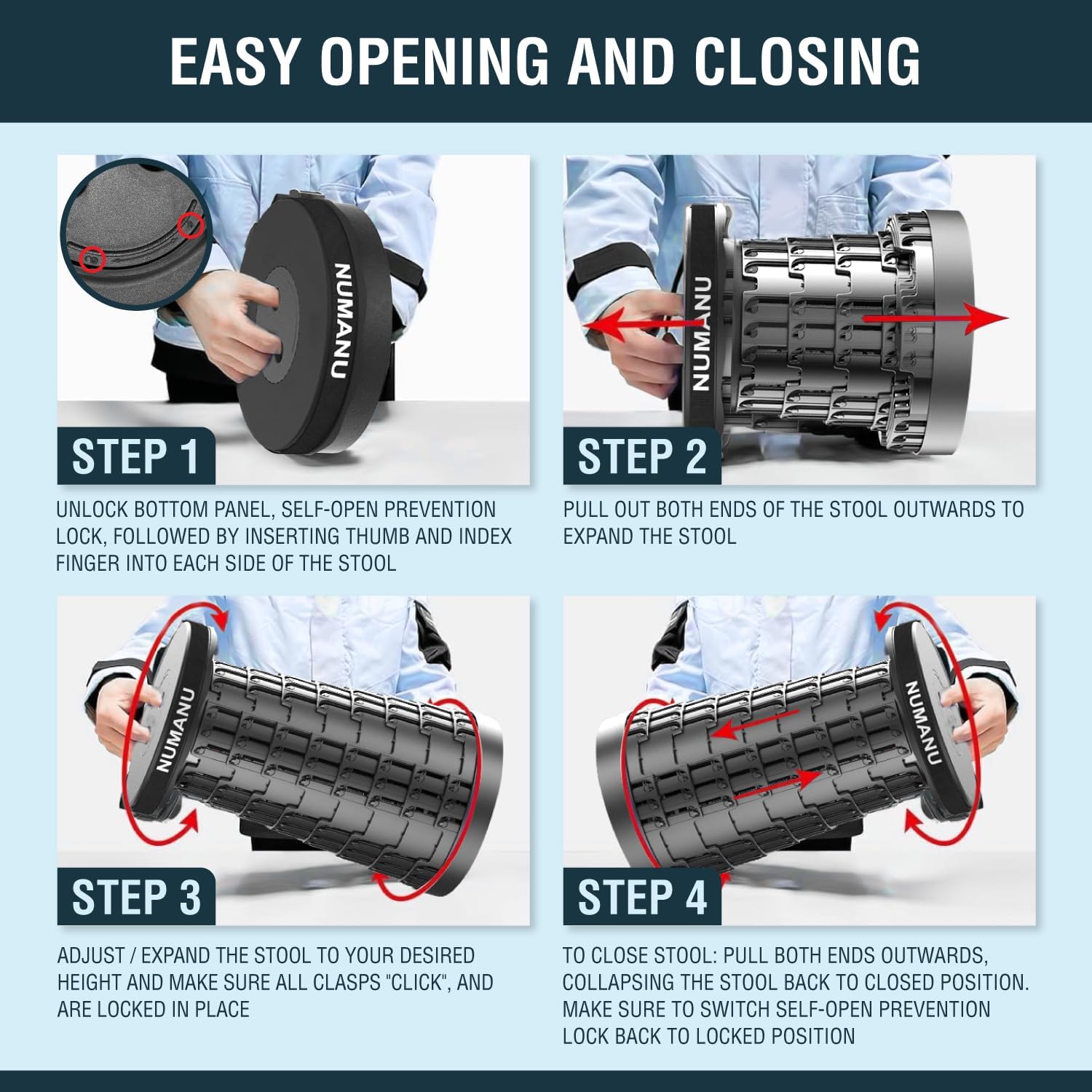 - 🔒【SELF-OPEN PREVENTION LOCK】Most Telescoping Stools do not properly lock and slip out unexpectedly while Collapsed / Closed. NUMANU's Telescopic Foldable Retractable Seat is always securely locked in place with our open-prevention Safety Lock.